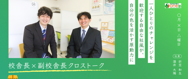 私たちは、学習塾運営事業やIT・インフラ事業を通じて、社会の発展に貢献することを目指しています。当社が展開する「個別指導のone塾」は、日本の教育の変化とお客様のニーズに合わせて自立型の個別指導塾を突きつめ、現在は国内外で30教室を展開しています。子どもたちが「自ら学ぶ力を育む」独自のプログラムを展開しながら、未来の社会を創る仕事に挑戦しつづけています。今回は「個別指導のone塾 さくら校」および「江曽島校」の校舎長を務める伊藤さんと、伊藤さんのもとで研修に励む新卒社員 稲見さんのクロストークを実施。二人の意外な関係性や、お互いの印象は?――ざっくばらんにお話しいただきました!【プロフィ...