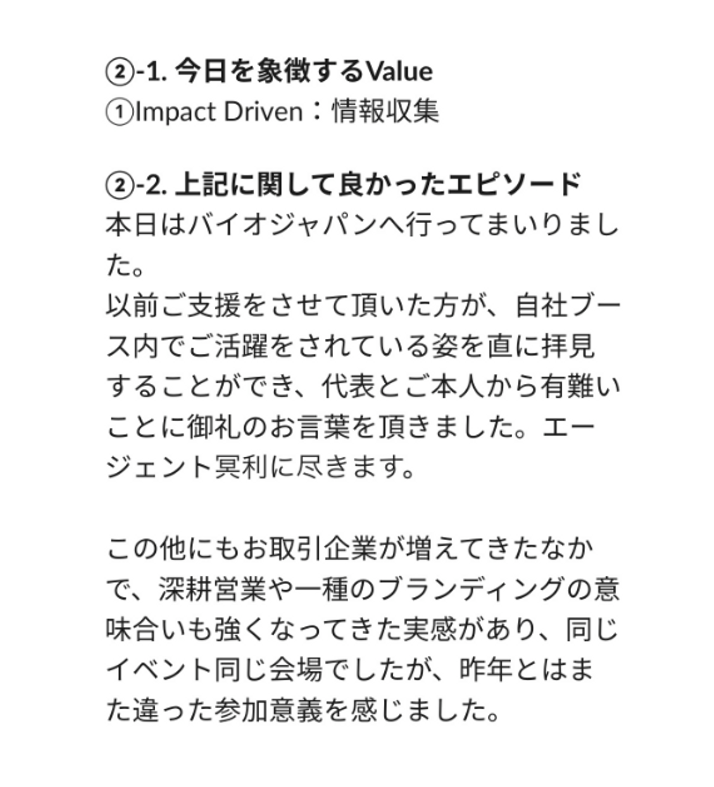 この3つのValueは、社員が毎日業務の終わりに提出する日報にも記載しており、日々意識できるようにしています。
