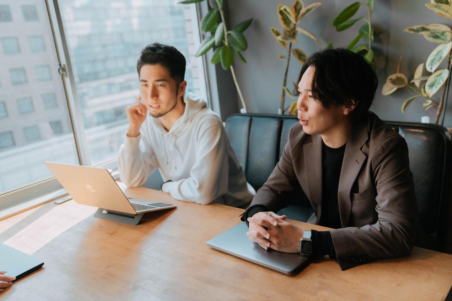 月一回の役員会議や週次などで行うリーダーMTGで話しています。あとは席も隣なので日常的に確認事項は適宜話したり、緊急性があれば会議室で相談したりしていますね。