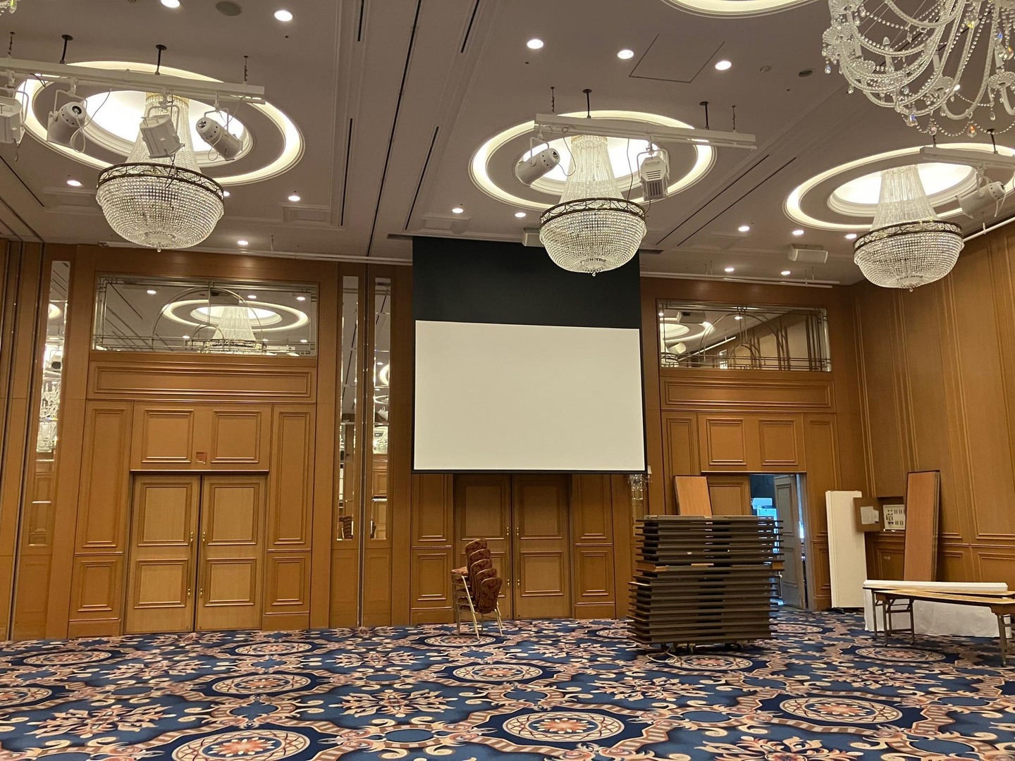 ・2日目の全社会議の会場確認(座席・音響機器、資料を投影するスクリーン、飲み物)