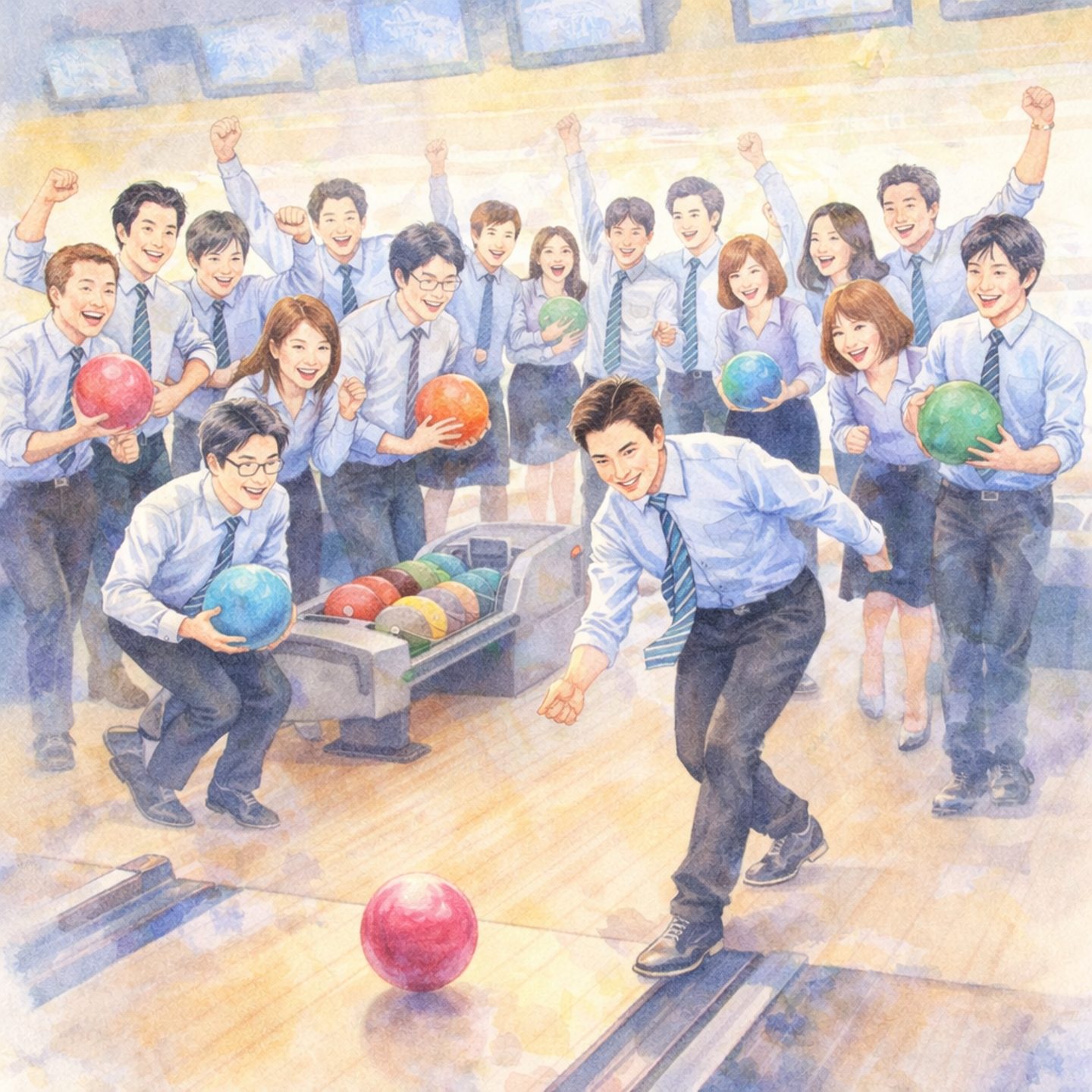 今回、東京支社でボウリング大会を企画することになったきっかけは、昨年10月の全社会議後に有志で行ったボウリングが一部社員の間で大変好評だったこと、全社会議に参加できなかったメンバーを迎えて、ボウリングがしたいね!との話から実現しました。