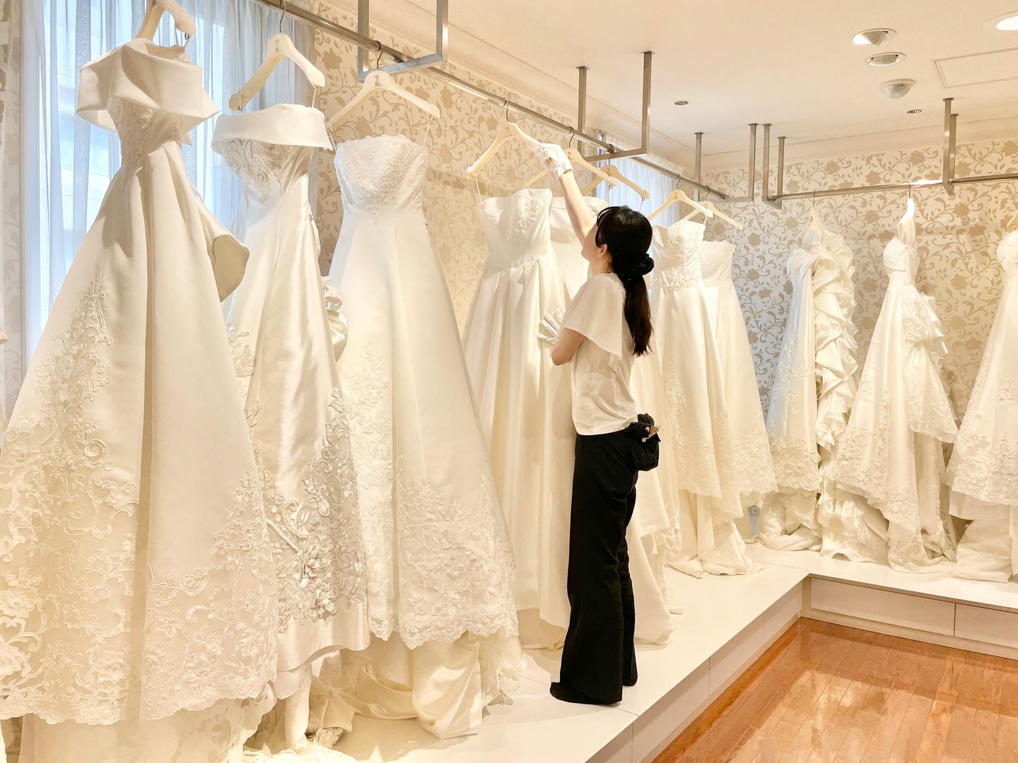 明るいショールームには所狭しとウェディングドレスが整然と並んでいます。きっと素敵なドレスに出会えるはず…