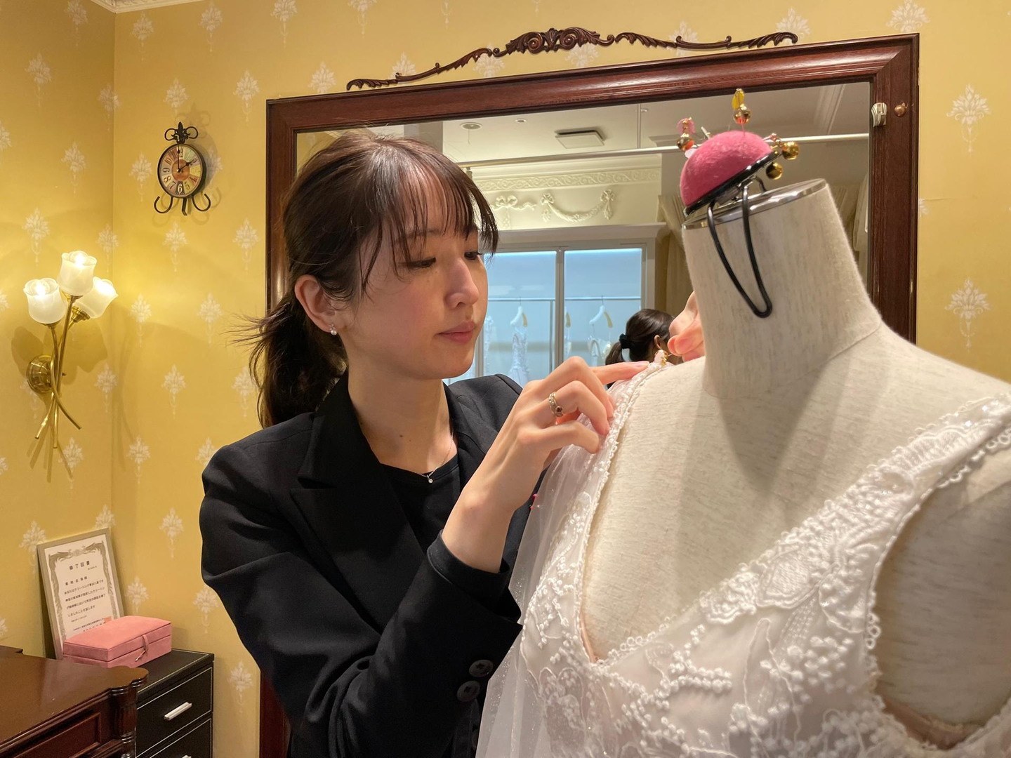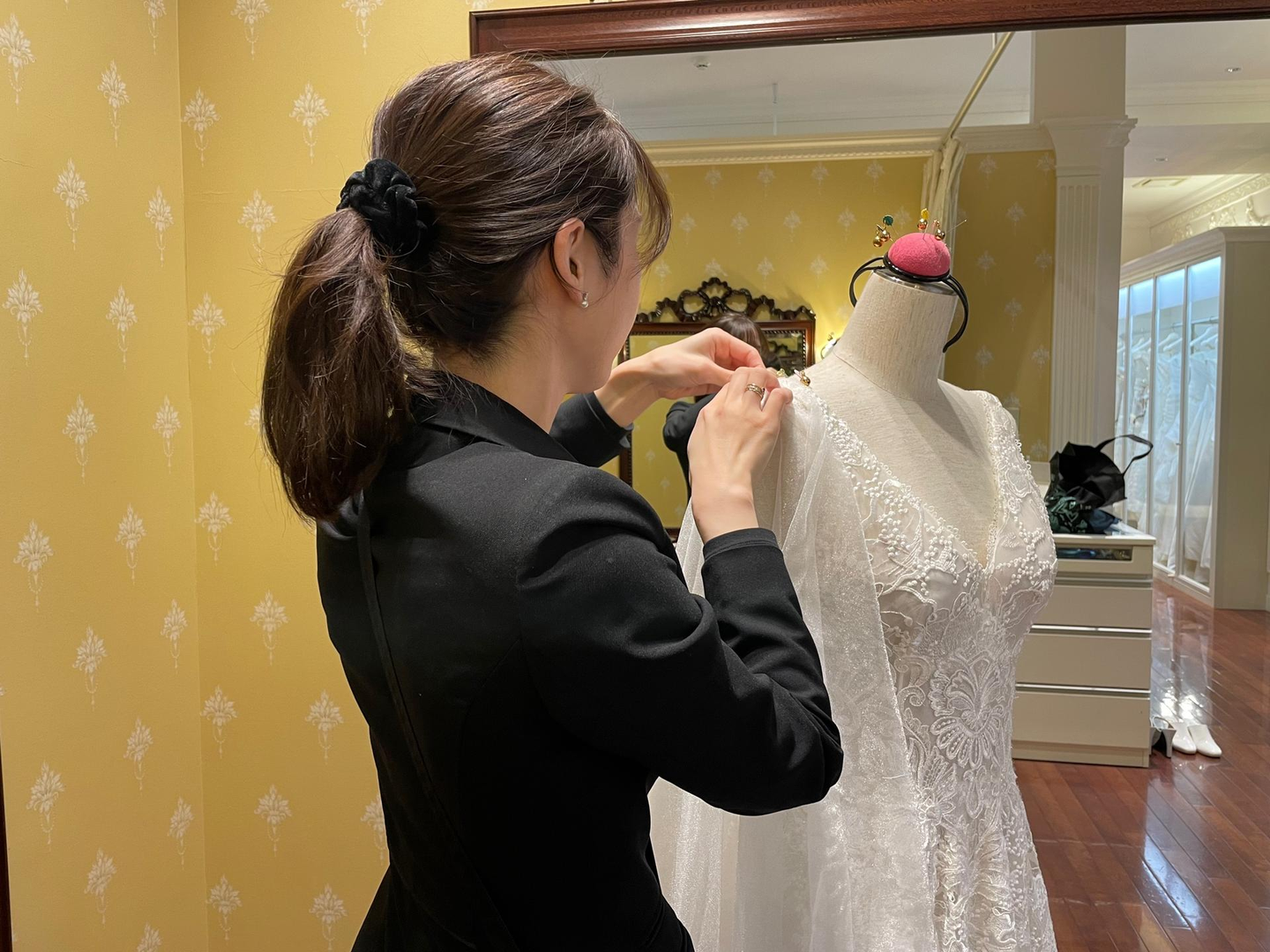 アパレルの販売員として働いておりましたが、専門知識を学びたいと思い服飾大学に入学、卒業して、モリノブライズに入社致しました。ウエディングパートナーとして3年間勤務し、希望であったドレスをお直しする部署へ異動して現在となります。学んでいた事を実践できたりその先の新しい知識を沢山学ぶことができます。これからは繊維や生地の特性等の知識を身につけ仕事に役立てたいと思います。