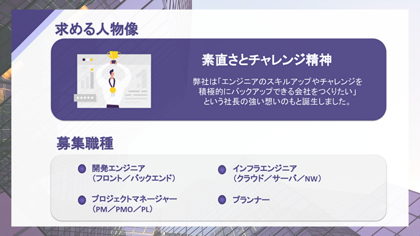 改めてお伝えしますが、弊社では「素直さとチャレンジ精神」を持った方を求めております。