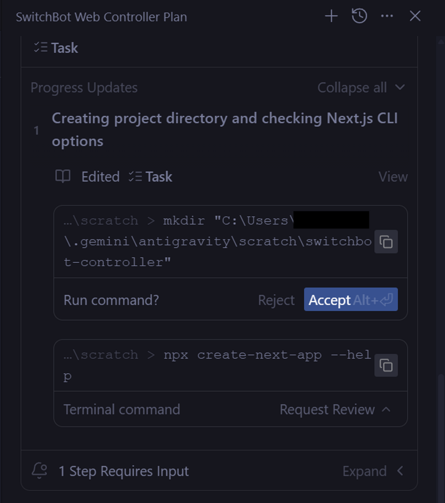 「ディレクトリ作っていい?」「コマンド走らせていい?」など、色々聞かれるので
