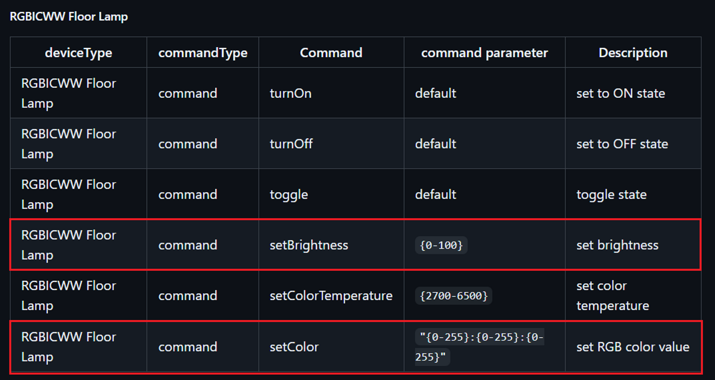 APIを眺めてたら照明は[setBrightness]や[setColor]の項目があったので、実装を頼めば