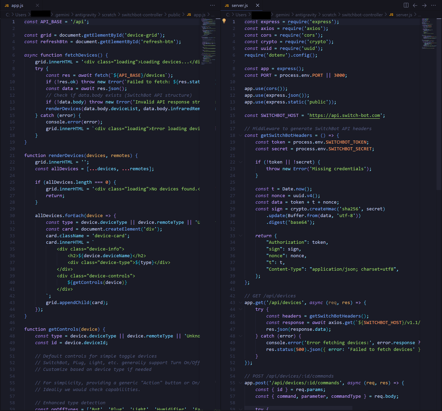 ・app.js(画面左)で画面上のボタンが押されたことを検知してローカルサーバへ命令を送信