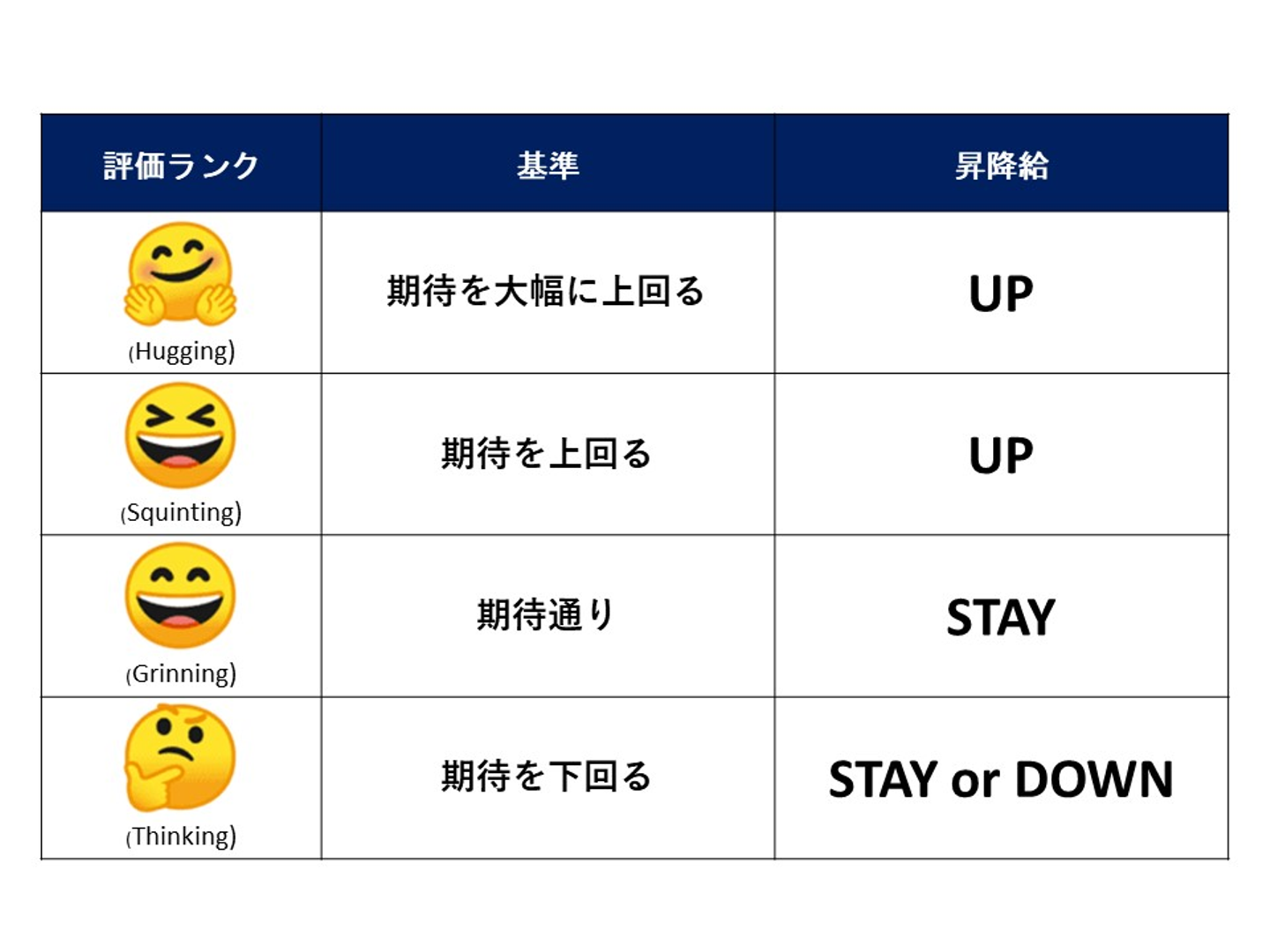 絵文字だけ、ではなく、それぞれの絵文字に紐づく意味も記載していますが、評価する側もされる側もシンプルかつ明快に評価判断をできるようにしています。