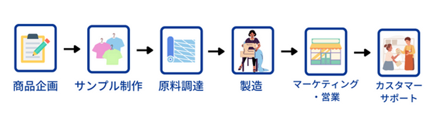 商品企画→サンプル制作→原料調達→製造→マーケティング・営業→カスタマーサポート