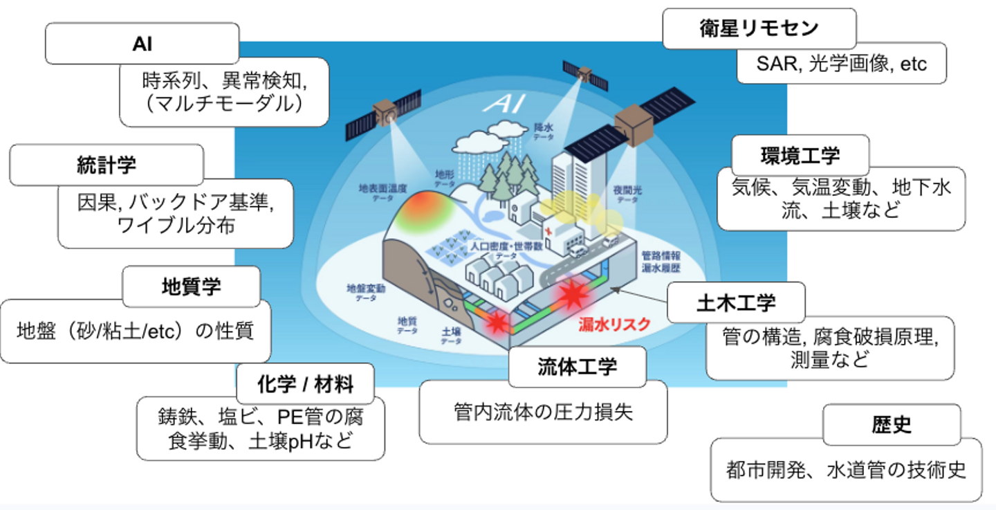 水道管が破損する理由を考えると、化学的なものだったり、地震などの物理的な原因だったり。衛星データも必要だし、地質の知識も必要。水道管の材質や歴史といった社会的な背景、人口の増減も関係してくる。AI以外の分野がめちゃくちゃ多いんです。