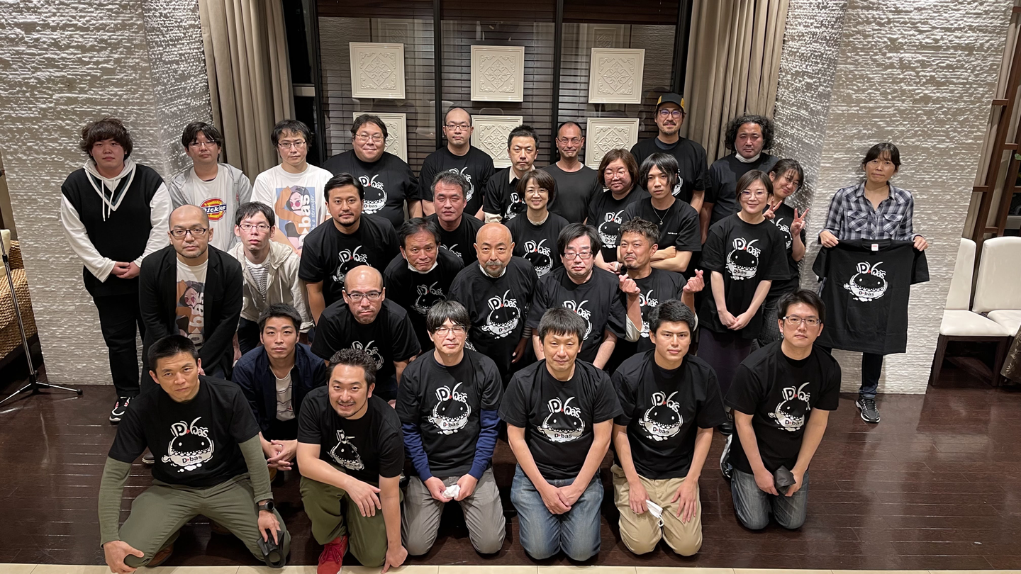 最後は全員でD-basオリジナルTシャツを着て記念撮影をパチリ。皆、笑顔で話題の尽きない祝賀会でしたが、以上をもって祝賀会の全イベントが終了しました。