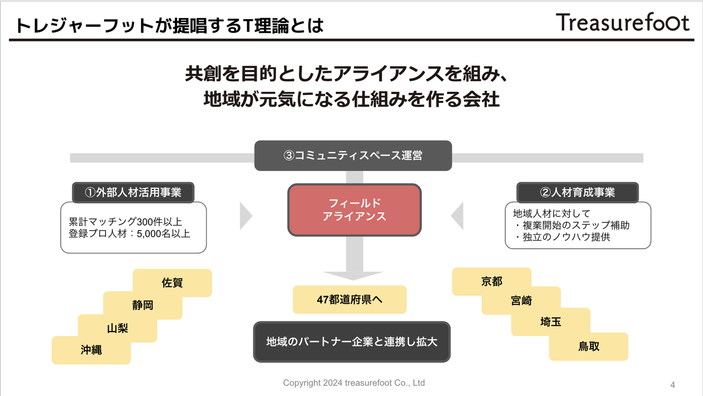 こうした循環を回していくことで、東京にスキルのある人が一極集中するのではなく、多くの人がより活躍する社会をつくることができます。3つの事業を有機的に連携・循環させることで、地域経済の活性化、人材育成、そして持続可能なコミュニティ形成を実現することを目指すのが、トレジャーフットの提唱する「T理論」です。