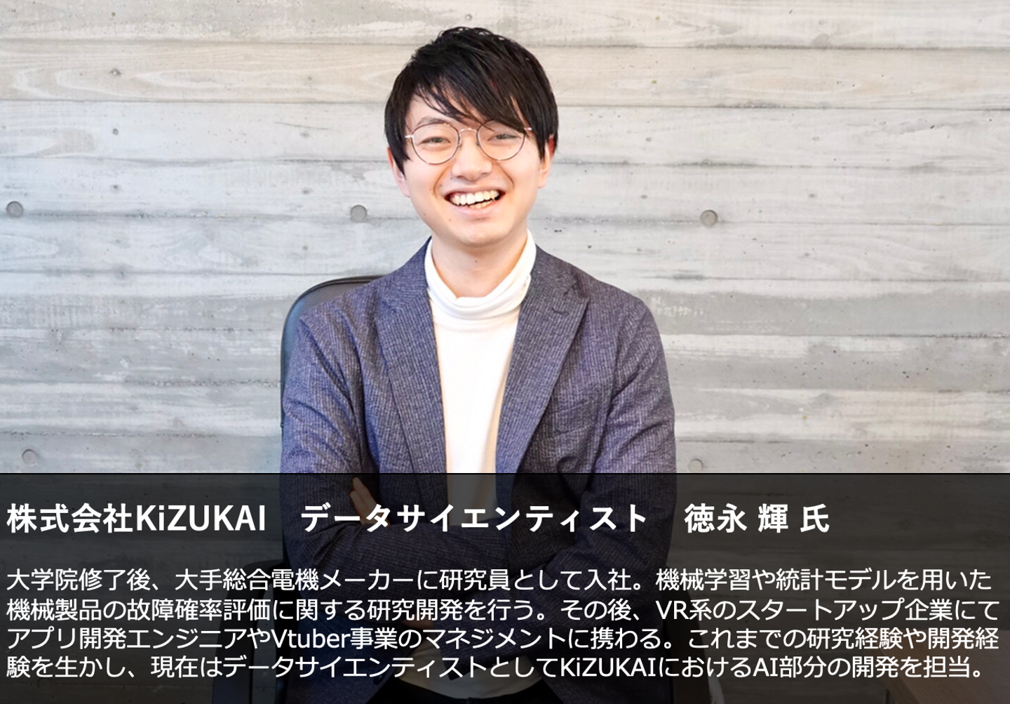 こんにちは。株式会社KiZUKAI採用チームです。今回はデータサイエンティストとして、KiZUKAIのAI部分の開発を担当している徳永 輝(とくなが あきら)氏にインタビューをしました。学生時代に研究していた機械学習のことや大学院卒業後に就職した大手電機メーカー系の研究所についてなどを掘り下げていきたいと思います。