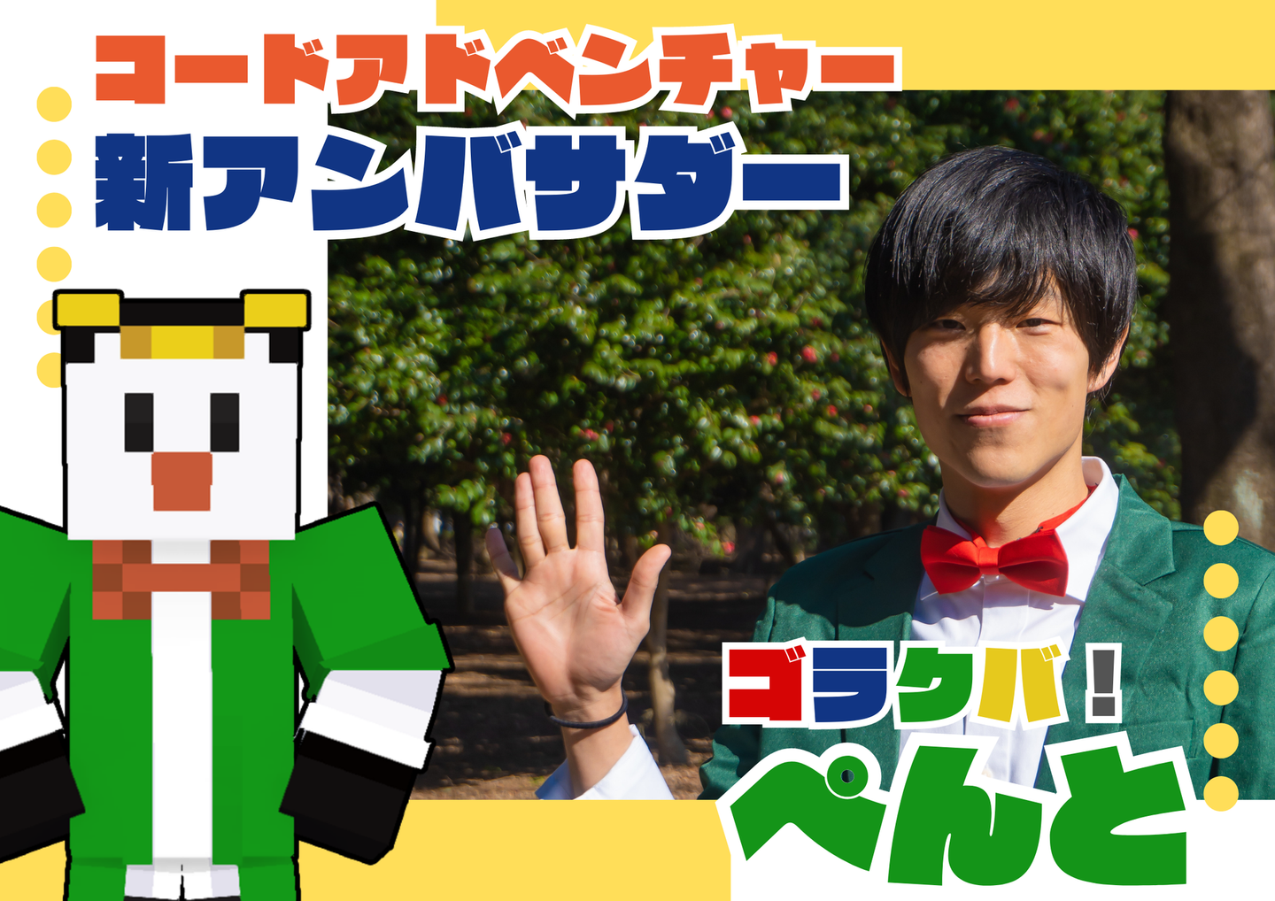 本日、コードアドベンチャーは、人気Youtuber「ぺんと」が当社の新アンバサダーに就任したことを発表します。「ぺんと」は、「ゴラクバ!」というYouTubeチャンネルでマインクラフトのゲーム実況を中心に活動しており、幅広い年齢層に人気を誇っています。
