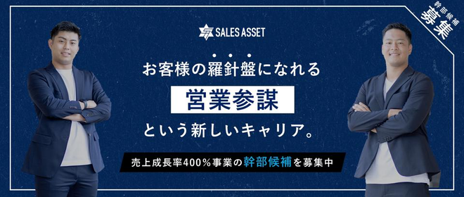 SALES ASSETは成長を望む企業と人の挑戦を支援をする会社です。 「成長し続ける」企業・人であるために。“繋がり”と“仕組み”を軸とした営業支援で、人と企業の挑戦をサポートします。 「営業参謀」は、顧客の事業成長を営業の側面からサポートするパートナーサービスです。単なる業務代行ではなく、貴社の事業戦略を深く理解し、その上で最適な営業戦略と戦術の策定から実行、さらには内製化までを支援します。私たちは、ただのサポーターではなく、顧客の成長を共に目指す戦略的パートナーです。
