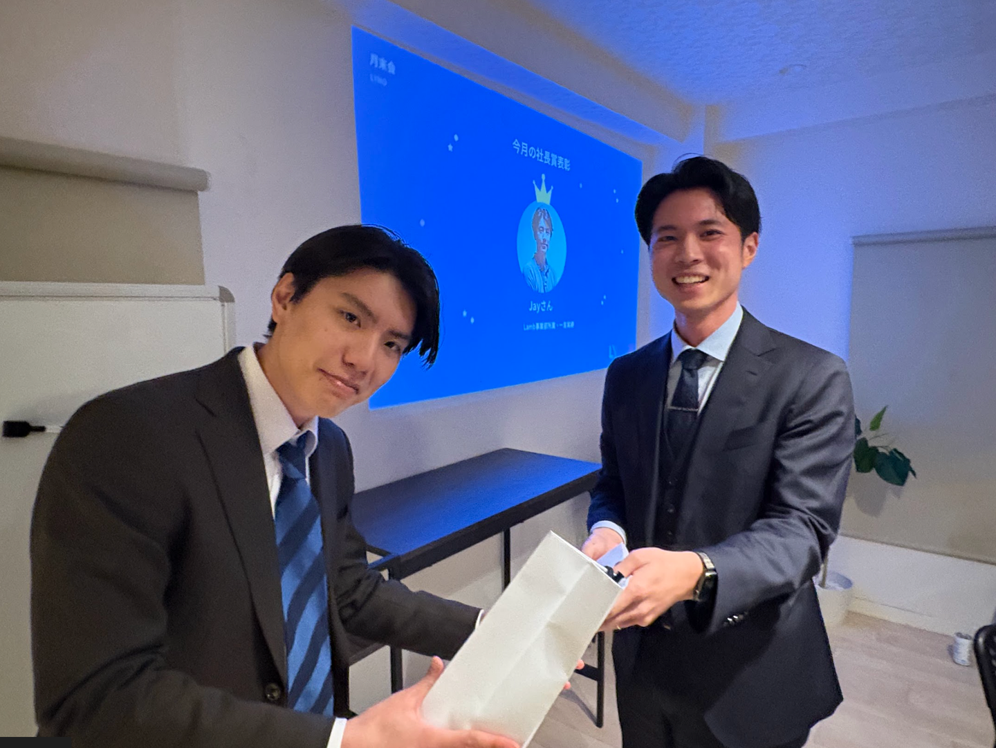 社長賞には、島田さんが選ばれました。代表の穂積から直接プレゼントが贈られ、「チーム全体を支え、組織の成長に大きく貢献してくれた」とのコメントがありました。
