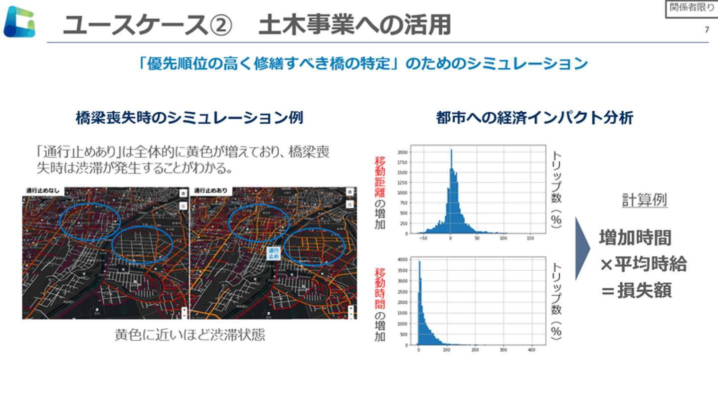 上図のように、人流データをもとに、橋梁喪失時(修繕期間)の交通量、移動時間、移動距離のシミュレーションを行うことで、経済インパクトを事前に把握することが可能となり、橋梁マネジメントの計画に役立てることが出来ます。