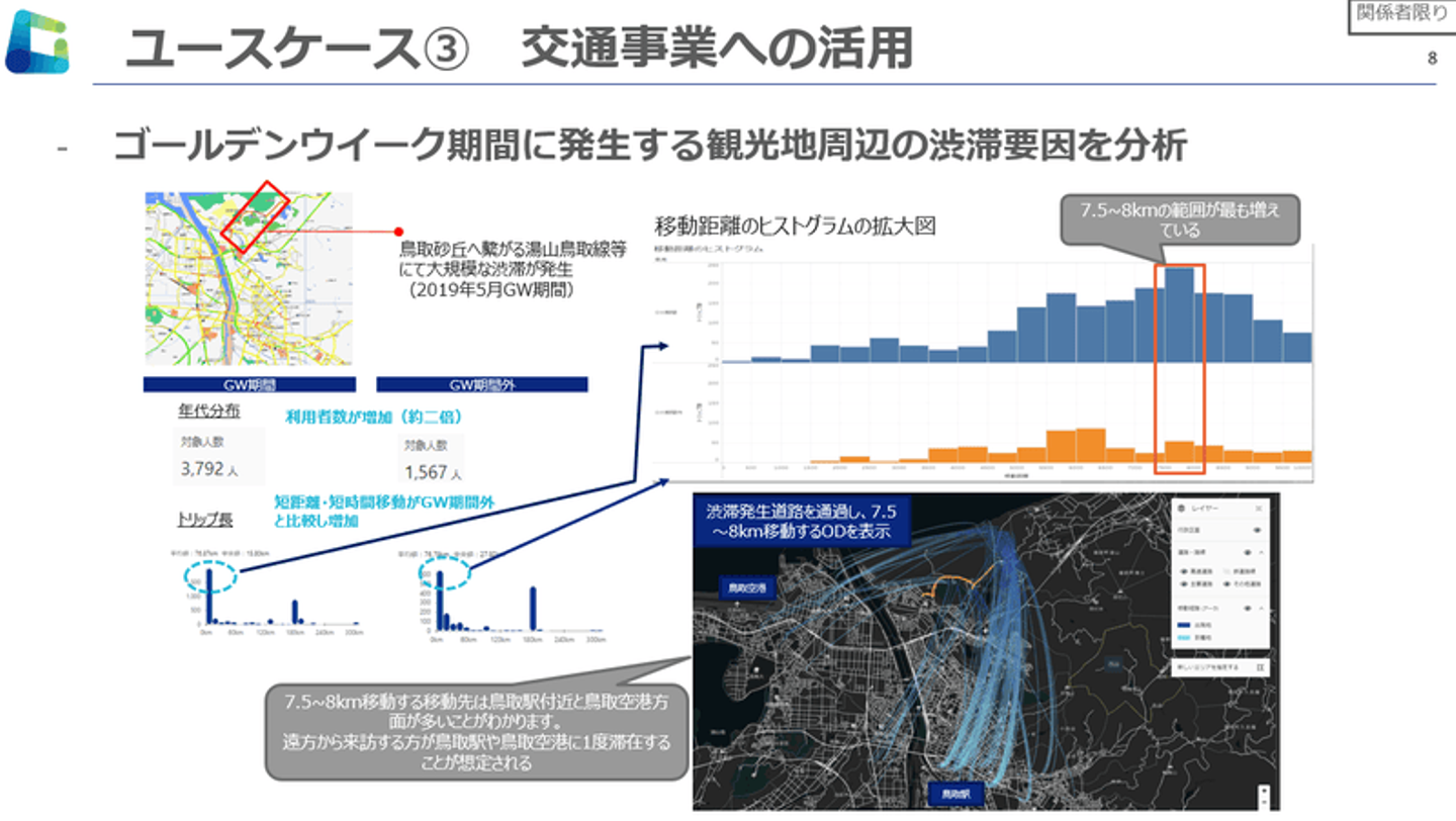 GW期間、鳥取砂丘へつながる湯山鳥取線にて大規模な渋滞が発生していました(図左上)。人流データをもとに詳しく見てみると、GW期間は湯山鳥取線の通過台数が急増し、短距離移動の割合が多いことが分かりました(図左下)。また、移動距離が10.0km以内の動きに注目すると、移動距離7.5~8.0kmの増加が著しいことが分かりました(図右上)。更に、7.5~8.0kmの移動のみ、移動経路を可視化すると、鳥取駅や鳥取空港方面への移動が多く見られました(図右下)。