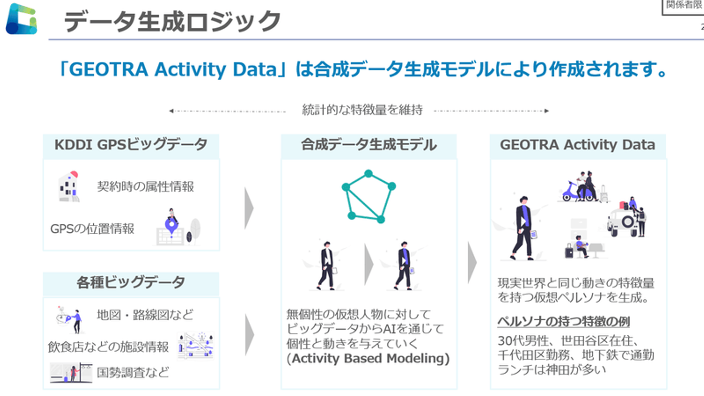 GEOTRAは、秘匿化・非特定化されたKDDI株式会社が保有するauのGPS位置情報ビッグデータや、地図・交通データ、公的データ、POIデータ (Point of Interest:地図上の特定の地点) 等の情報と、GEOTRA独自の合成データ生成技術等を掛け合わせ、分析自由度がより高く、将来予測を可能とする人流データを生成、ご提供しています。