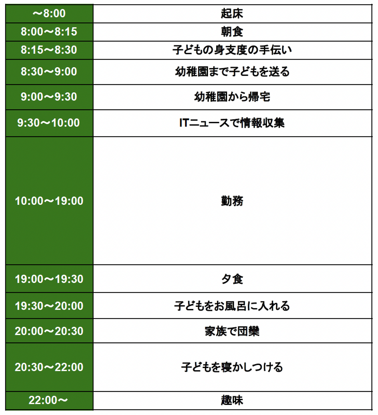 特に朝は子供のお世話が立て込んでいるので、10:00から勤務開始にしてもらっています。