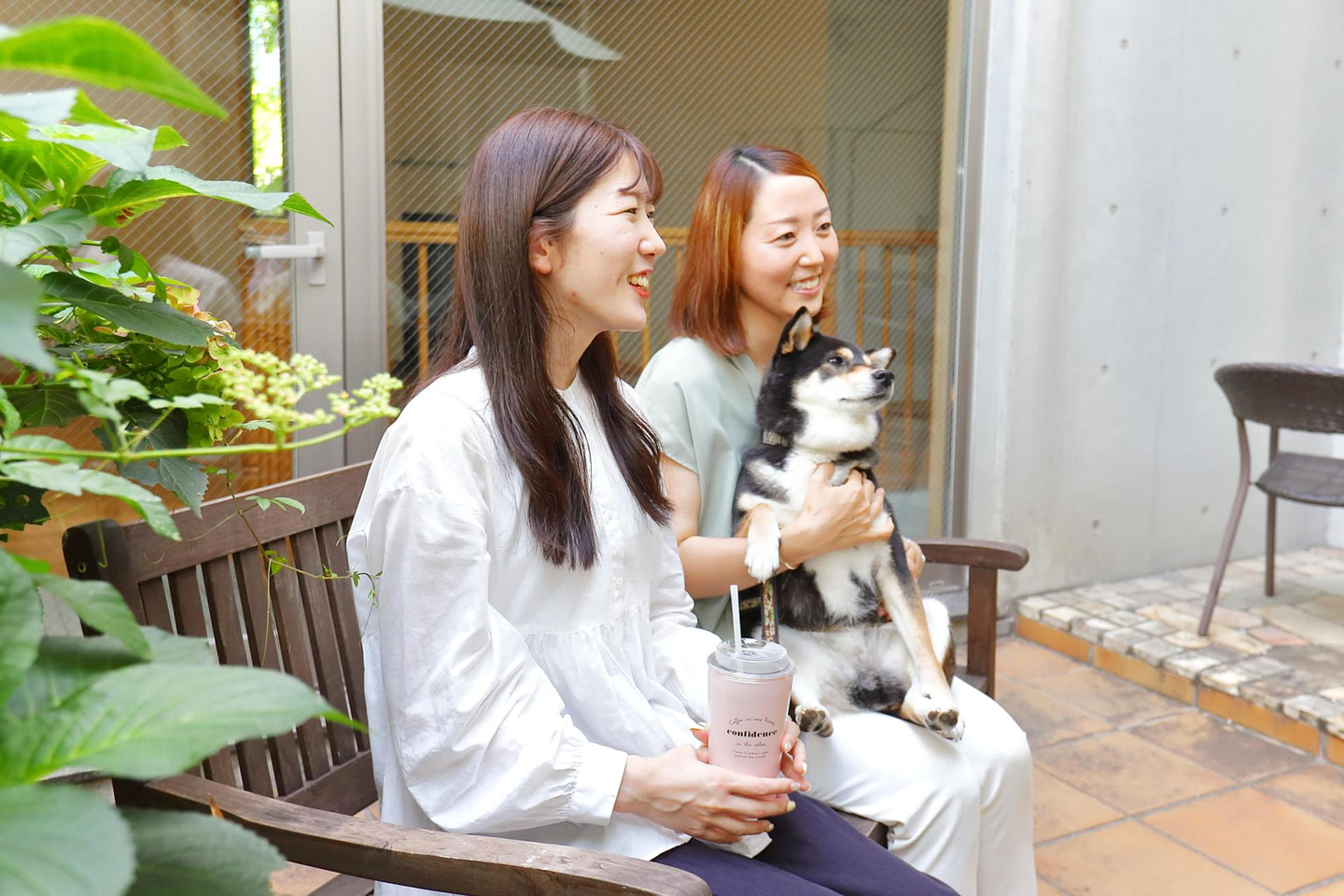 オフィスの1階テラスで、みんなでカジュアルミーティング。看板犬のマキシくんも一緒に。