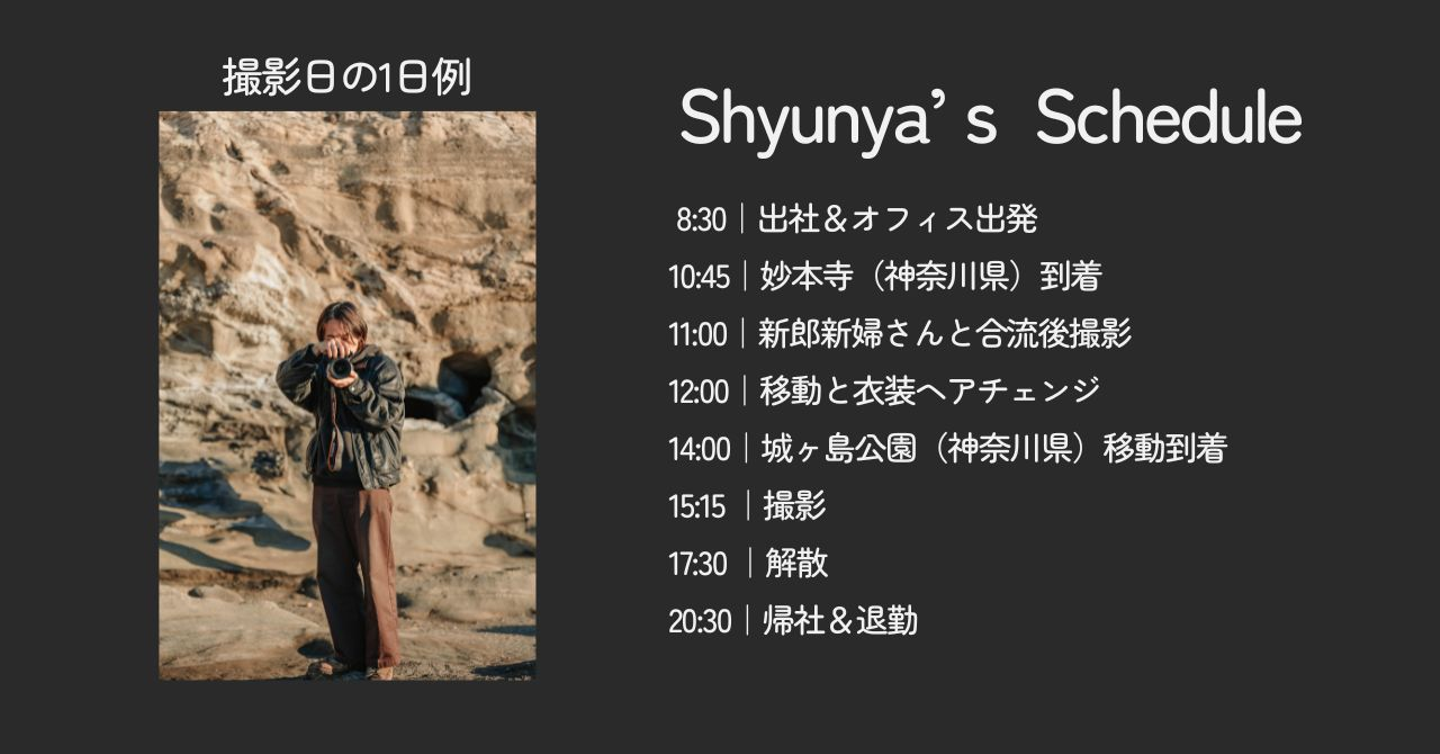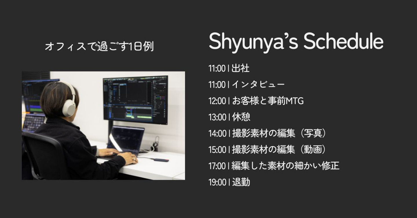 質問5.1日のスケジュールを教えてください。 しゅんや: 今日のスケジュールはこんな感じです。オフィスにいる際は、 撮影した素材の編集作業に集中 しています。撮影が近づくと、お客様との オンラインミーティング を実施し、 理想の撮影イメージ について詳しくお伺いします。お客様のご要望とカメラマンのイメージにズレが生じないよう、丁寧にすり合わせを行い、 最高の撮影ができるよう準備 を進めています。
