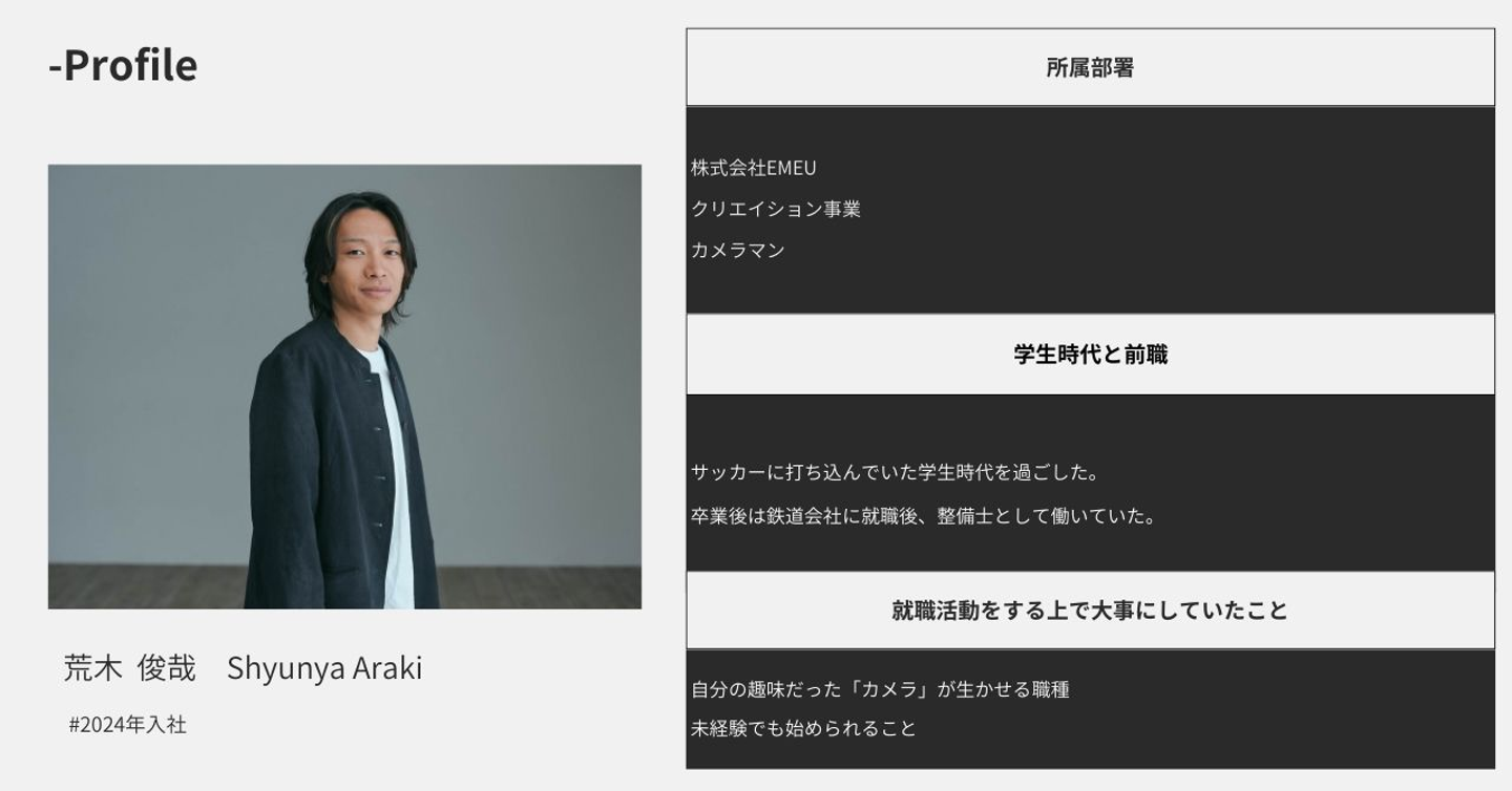 質問10.入社を考えている方へ しゅんや: 僕は長い間、 まったく違う職業からこの業界に飛び込むこと に対して、なかなか踏み出せずにいました。でも、EMEUに入社してみて、「 遅い 」とか「 今までのジャンルが違う 」といったことは まったく関係ない んだと実感しました。 教えてくれる先輩たち もたくさんいて、実際にいろんな現場で 経験を積ませてもらえる環境 があるので、 毎日やりがい を感じています。 「 荒木さんに撮ってもらって本当に良かったです 」 「 この会社にお願いしてよかった 」 「 いつか娘が結婚する時は、前撮りはEMEUにお願いしたいと思いました 」 そんなふうに、お客様が 直接顔を見て伝えてくれる言葉や笑顔 が、心の底から嬉しくて、 自分の原動力 になっています。 今、カメラマンを目指したいけど迷っている人がいるなら、今回の僕 のインタビューが、その背中を少しでも押すきっかけ になれば嬉しいです。