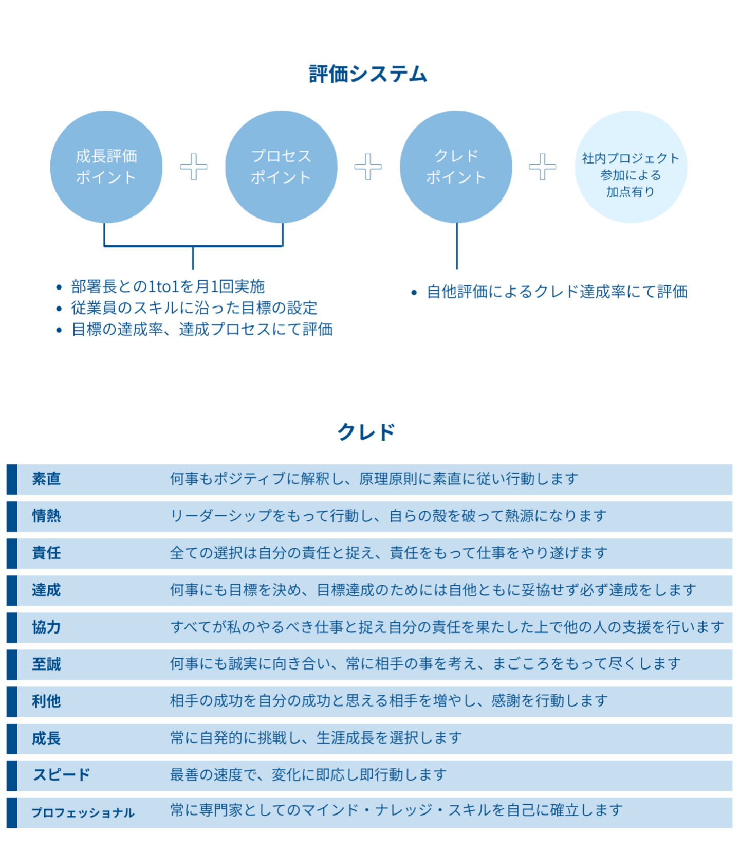 評価軸は「成長評価」「プロセスポイント」「クレドポイント」の3つ。これらの項目はすべて明文化されており、自分がどこで評価され、どこに伸びしろがあるのかを明確に把握できます。