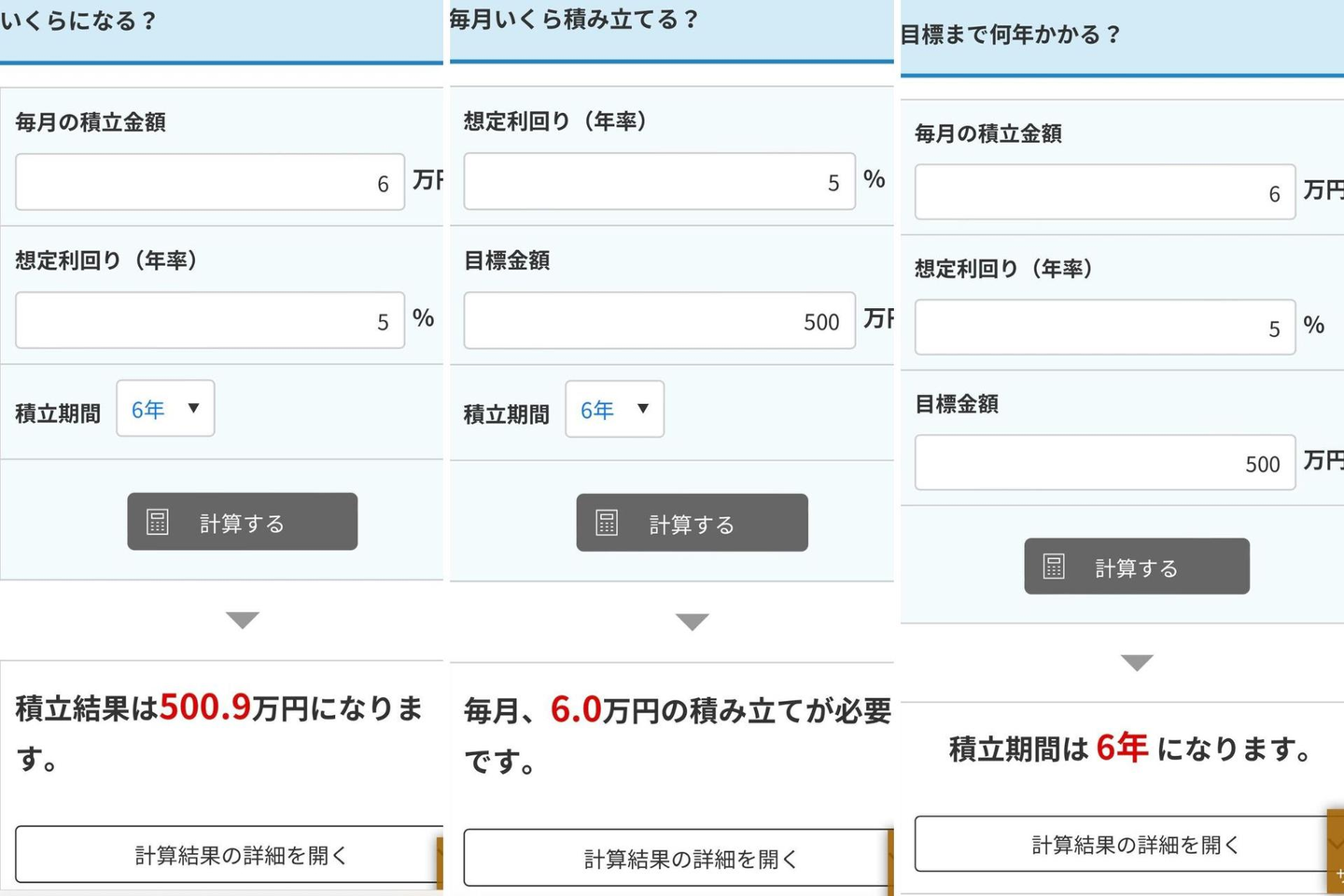 「いくらになる」「何年かかる」「毎月必要な積み立て額」がわかるようになっています。