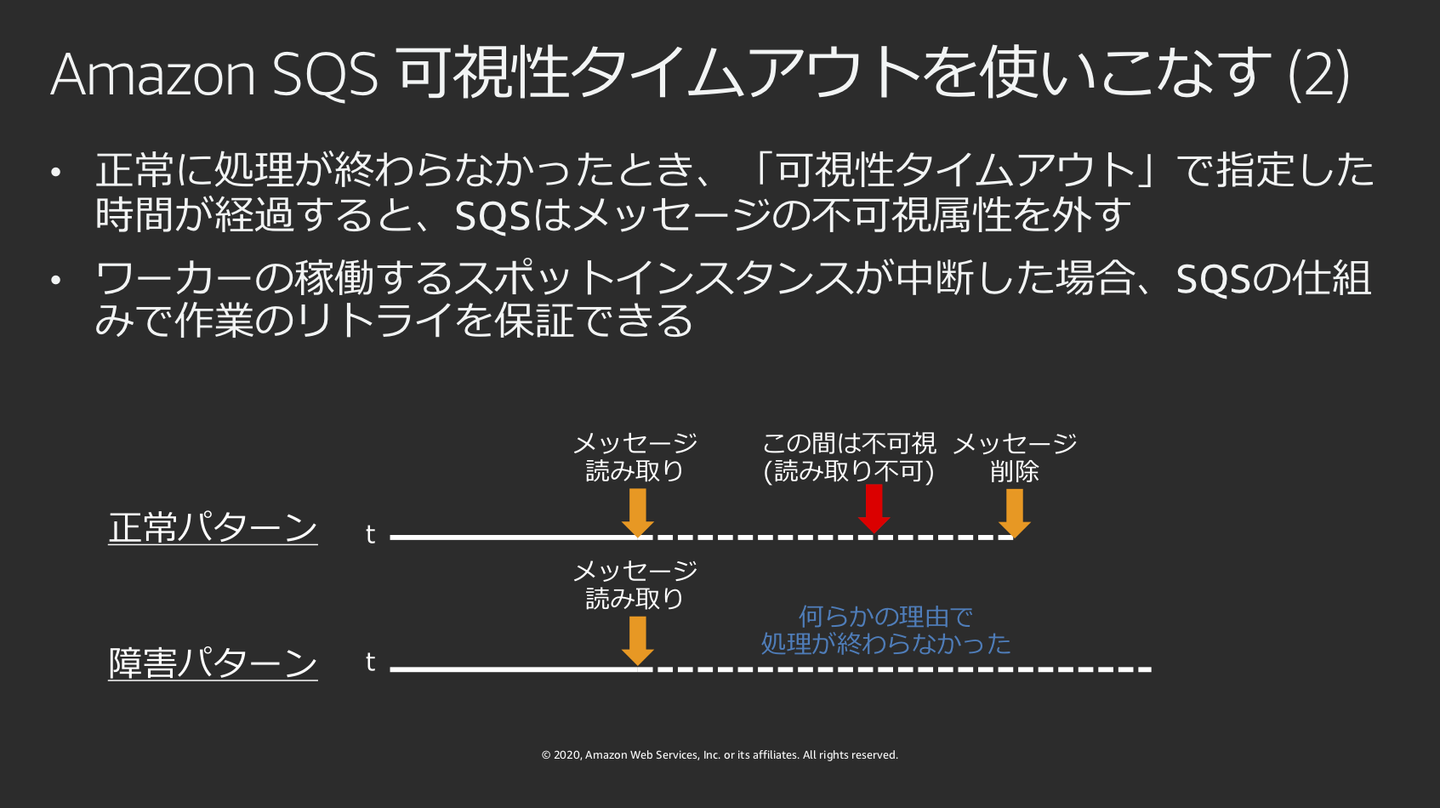 また、もしスポットインスタンスが突然落ちて処理途中でコンテナが落ちてしまっても可視性タイムアウトが過ぎればまた同じメッセージを受け取れるため、処理を継続することが可能となっています。
