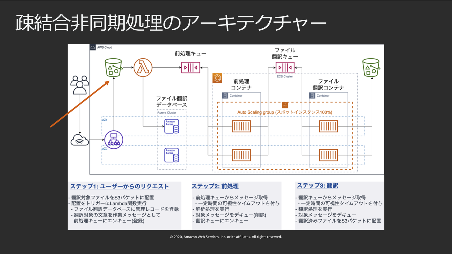 このほか、コンテナを素早くスケールアウトさせてファイル翻訳処理が詰まらないように Lambda でスケール処理を仕込むなど行なっているなど色々工夫点はあります。
