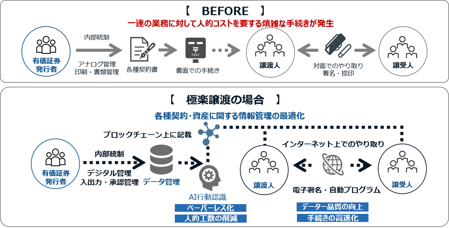 これにより、ペーパーレス化、人的工数の削減、データー品質の向上など、資産の譲渡に関する手続きの高速化から各種契約・資産に関する情報管理の最適化が可能となります。