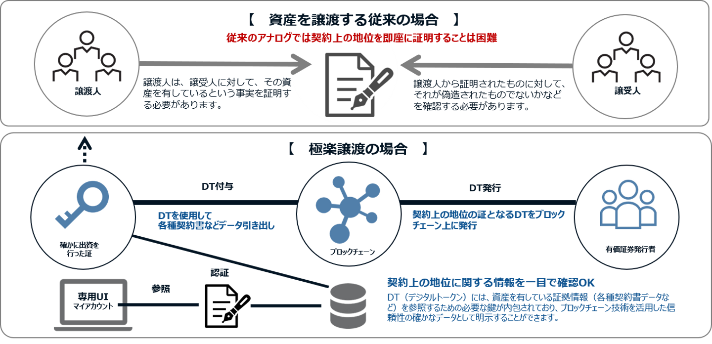 現行の日本法の枠組みの下で、定義化されたプログラム(スマートコントラクト)により、譲渡に対する各契約に付随する一連の合意・承諾手続きを行うことができます。