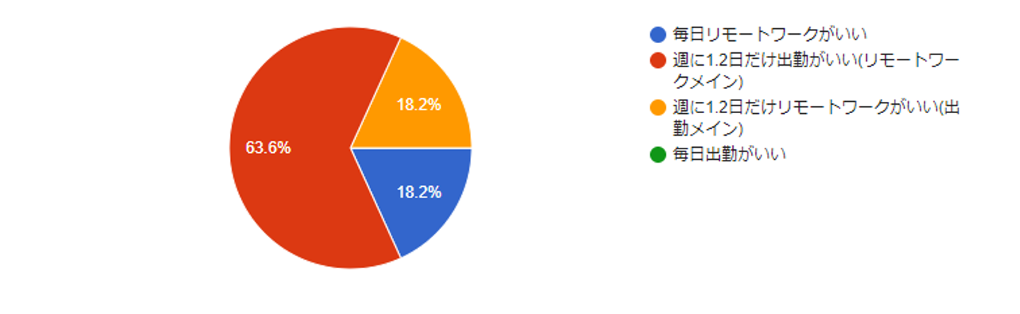 ほぼリモートワークで良いけれど、たまにはチームのメンバーと顔を合わせて会話したい。 リモートワークでしっかり運用できているのであれば、月1出勤とか、「今日は出社の気分」みたいな気分で 出勤でも良いと思う。(Wさん)フェーズごとに、上流は対面がよい。開発フェーズなんかはリモートで十分と個人的には思います。(Mさん)週に1.2日だけリモートワークがいい(出勤メイン)と答えた人の意見