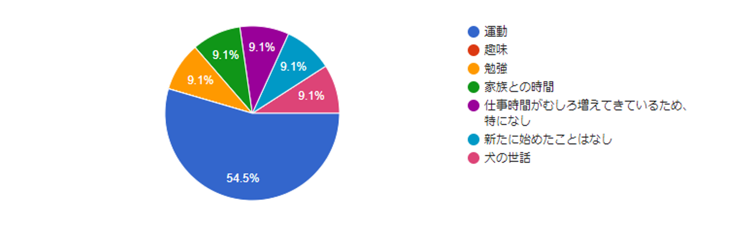 応用情報技術者試験の勉強。(Nさん)家族との時間:家族との時間が増えて、時間に余裕が出来た。(Kさん)犬の世話:新たに犬を迎え入れ、遊んでいる(Tさん)リモートワークで体を動かすことが減ってしまったので筋トレ、ランニング、ストレッチなどの運動系を始めた方が多かったですね。