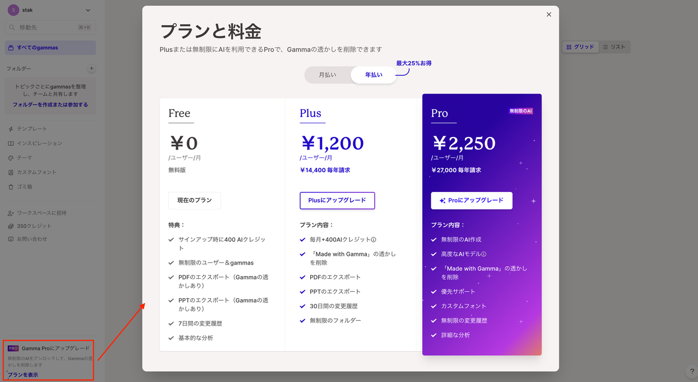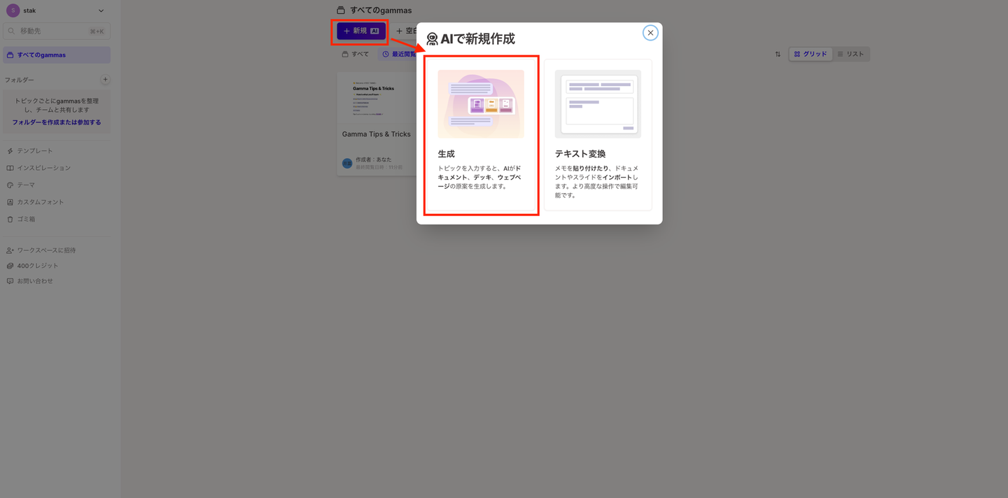 Gammaでは、クレジットを消費することでスライドを生成できます。