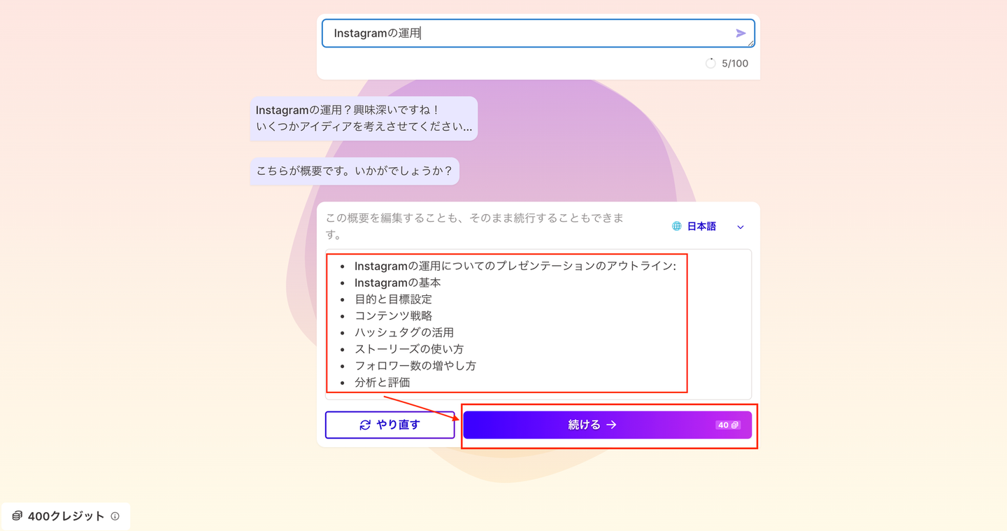 まずは、無料プランで400クレジット分のスライドを作成してみて、使えそうであれば有料プランを検討するのが良いですね!