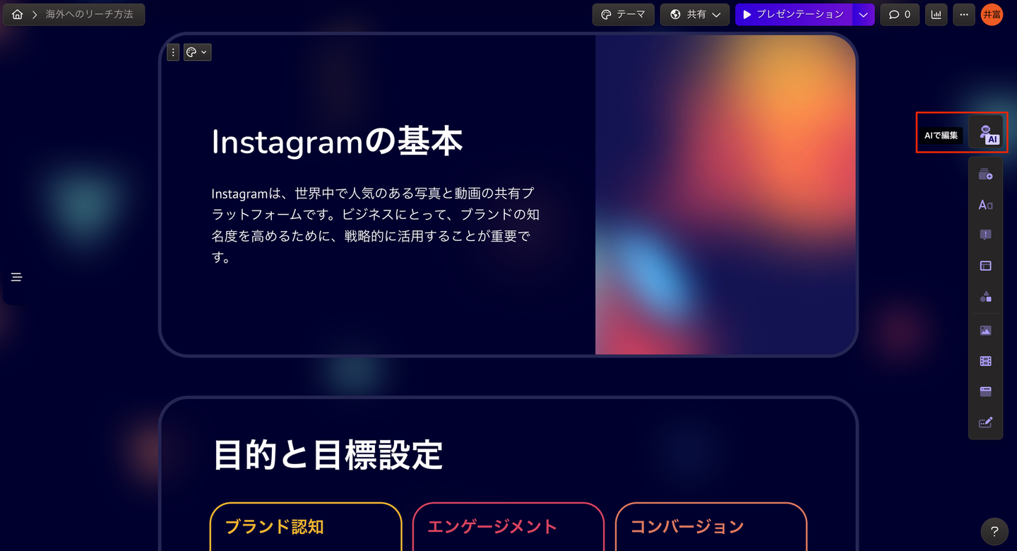 画面右側のメニューから、一番上の『AIで編集』をクリックします。