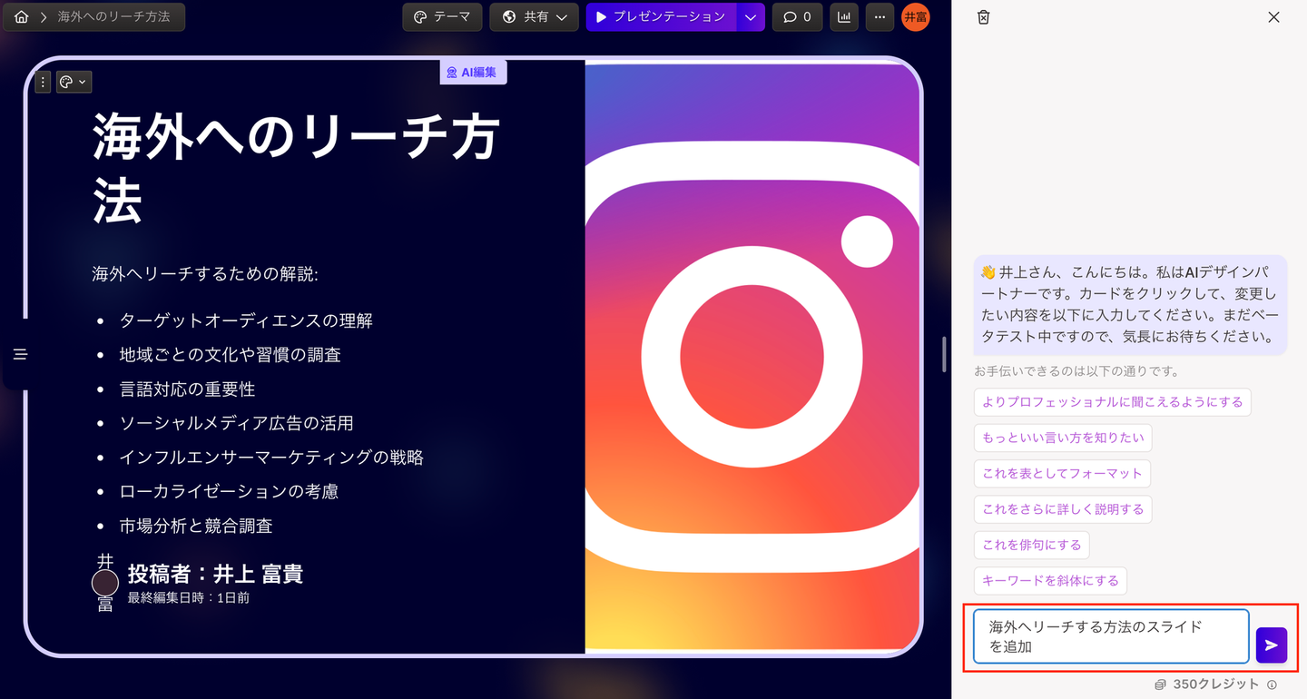 もちろん、テキストの打ち替えや画像の差し替えは手動でもできますが、今回はAIを使った編集を試していきます。