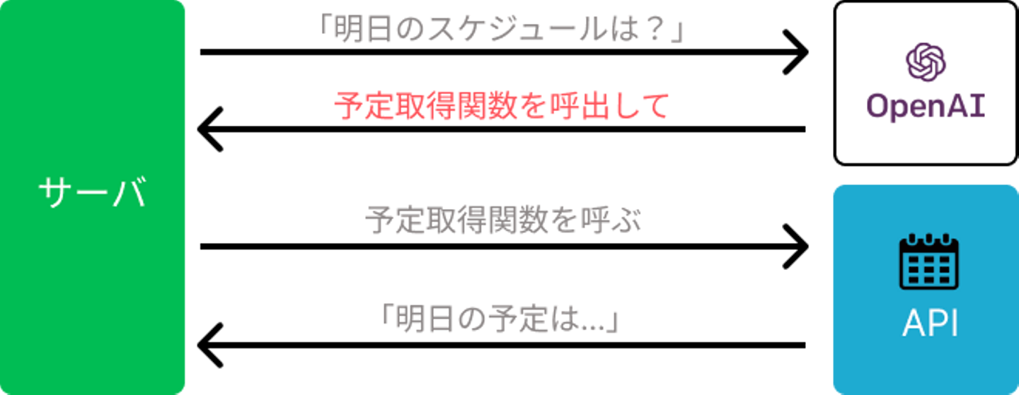 その情報を取得するにはスケジュールを管理しているサービスの予定を取得する関数(API)を呼び出す必要があるのですが、それを教えてくれるのがFunction callingです。