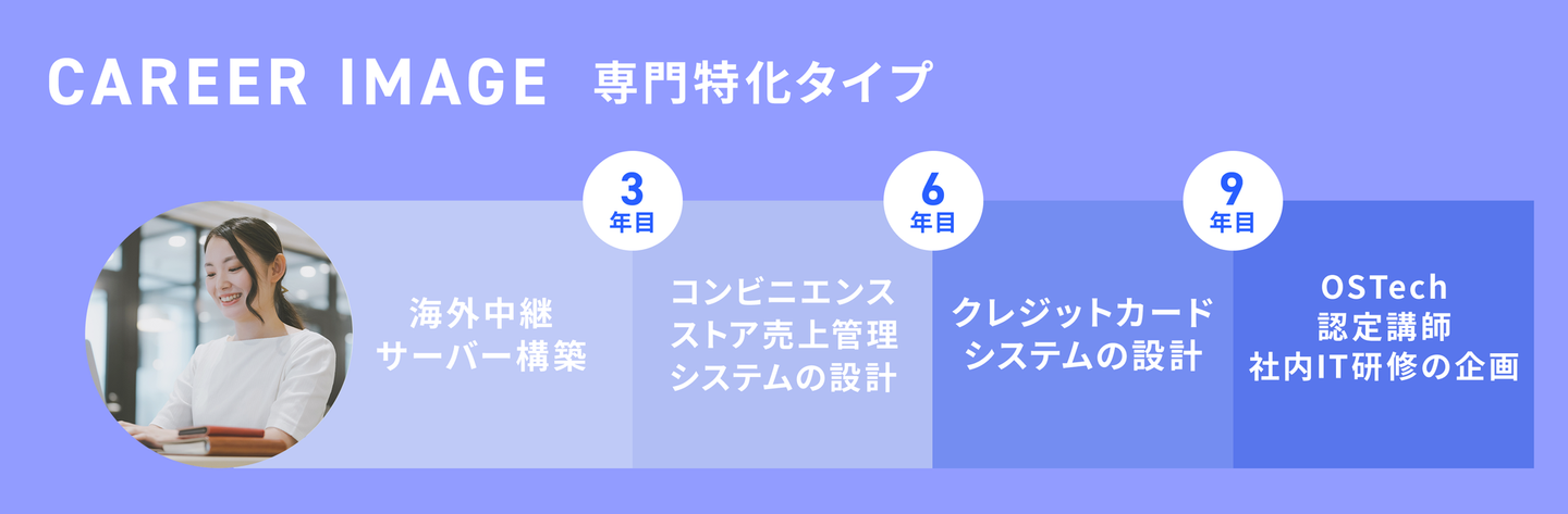 最終的には、習得した知識を武器にOSTechの認定講師に就任。社内IT研修の企画立案などを行っています。OSTehcでは、研修部門だけでなく、営業部門や採用部門に異動する選択肢もあり、柔軟なキャリアを描くことができます。