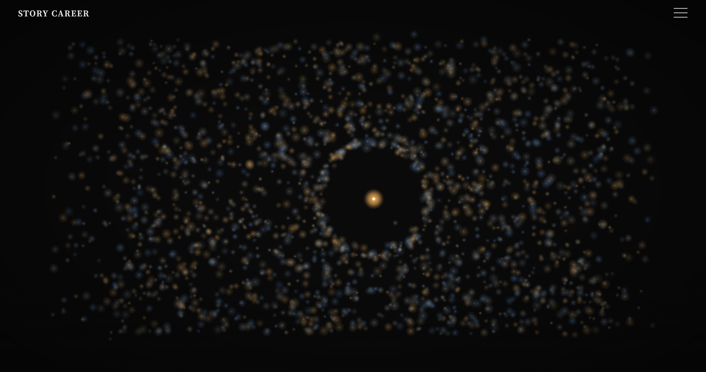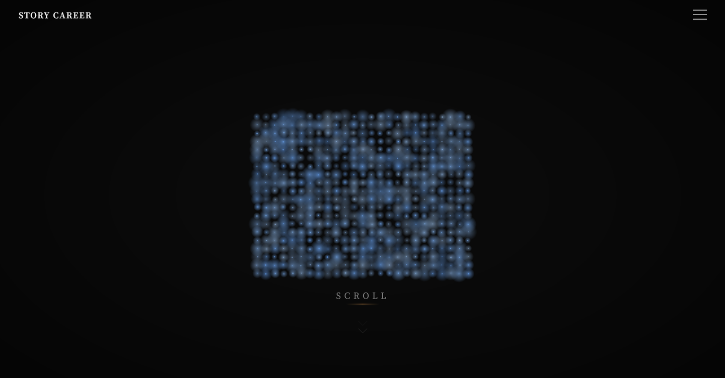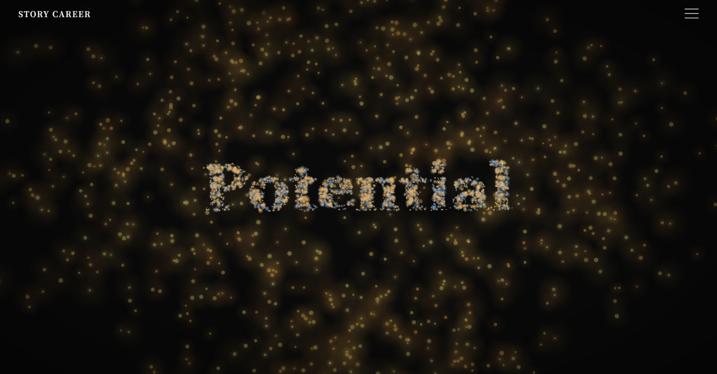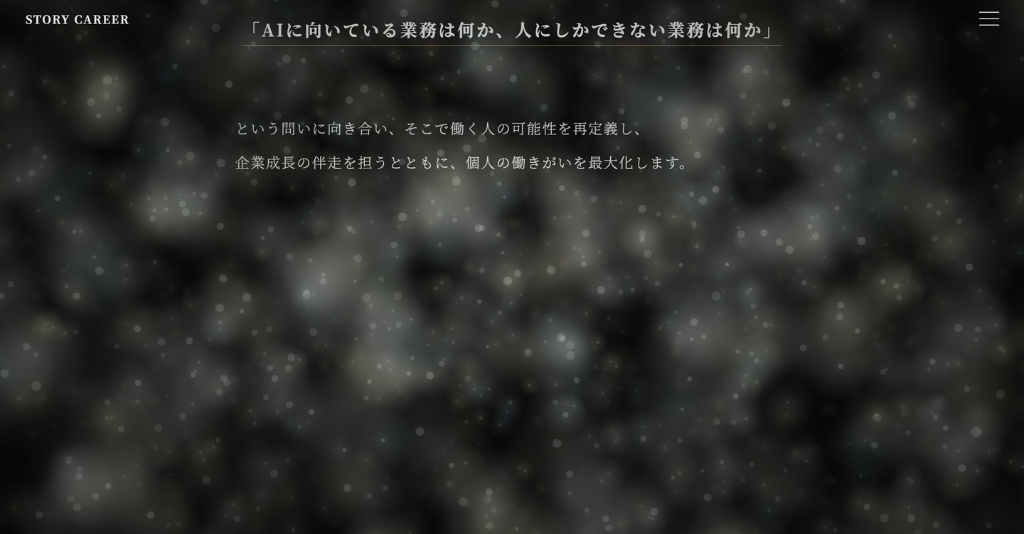 さらに、「人の可能性を再定義する。」のメッセージが浮かび上がった後、粒子は一つひとつ輝きながら画面の外へと飛び出していきます。既存の枠にとどまらず、人と組織の可能性を広げていくというSTORY CAREERの思想を表現しています。