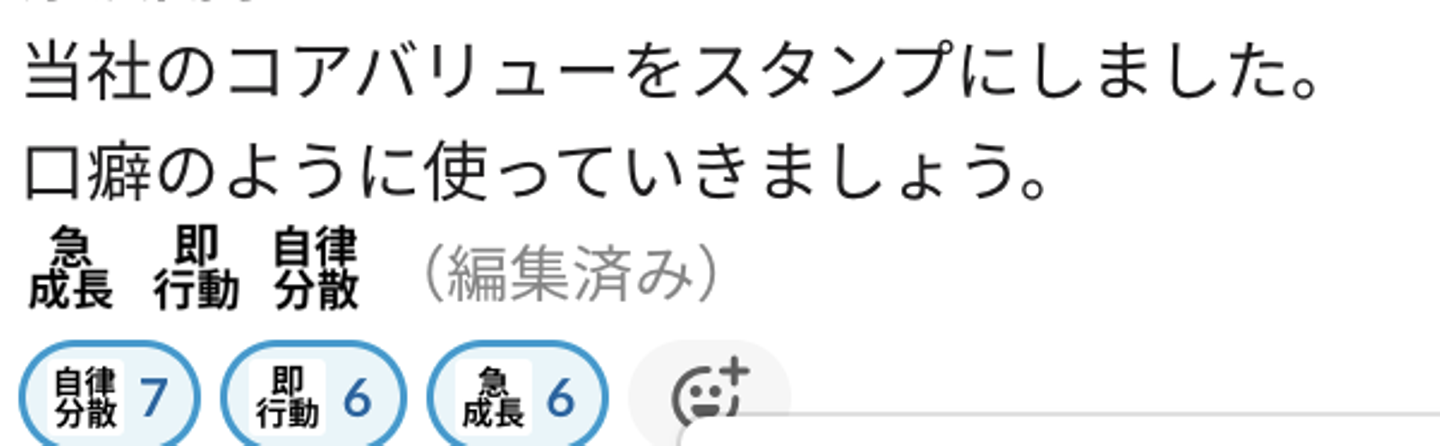 バリューは行動にあらわれて初めて効果を発揮します。社内での行動を評価する際に、バリューに則した行動が評価されるべきです。シンプルではありますが、バリューのスタンプをCEOはじめとしたメンバーが頻繁に使うことで組織に浸透していくのではないかと考えています。