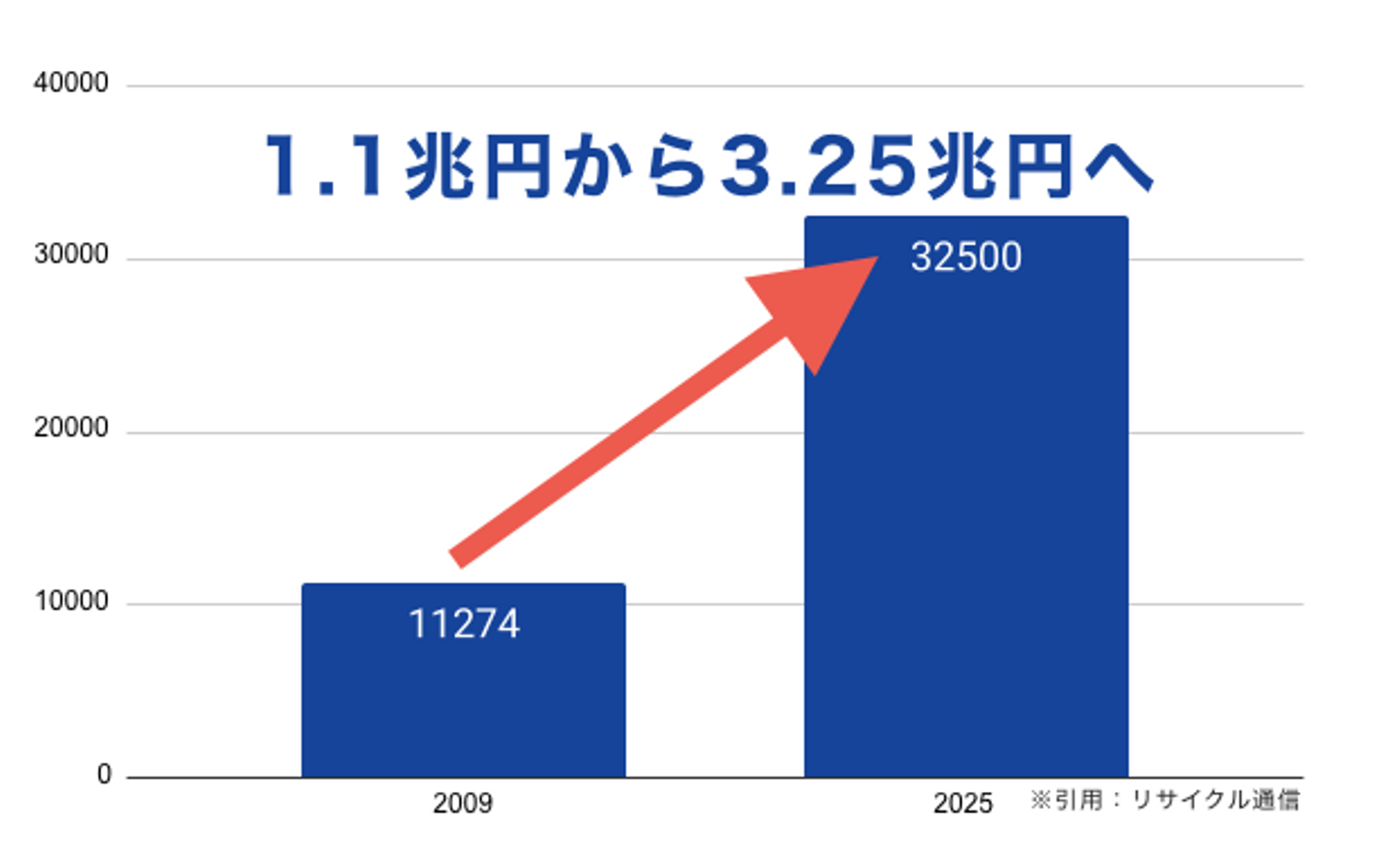 リサイクル業界の専門誌である「リサイクル通信」では、リユース市場の規模は2025年までで3.25兆円まで拡大すると予想しています。(2009年時では1.12兆円)