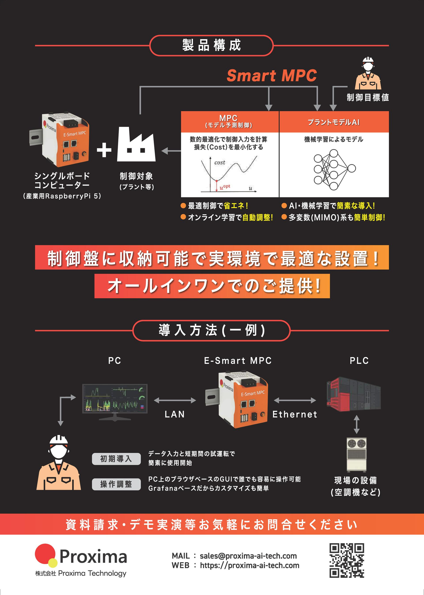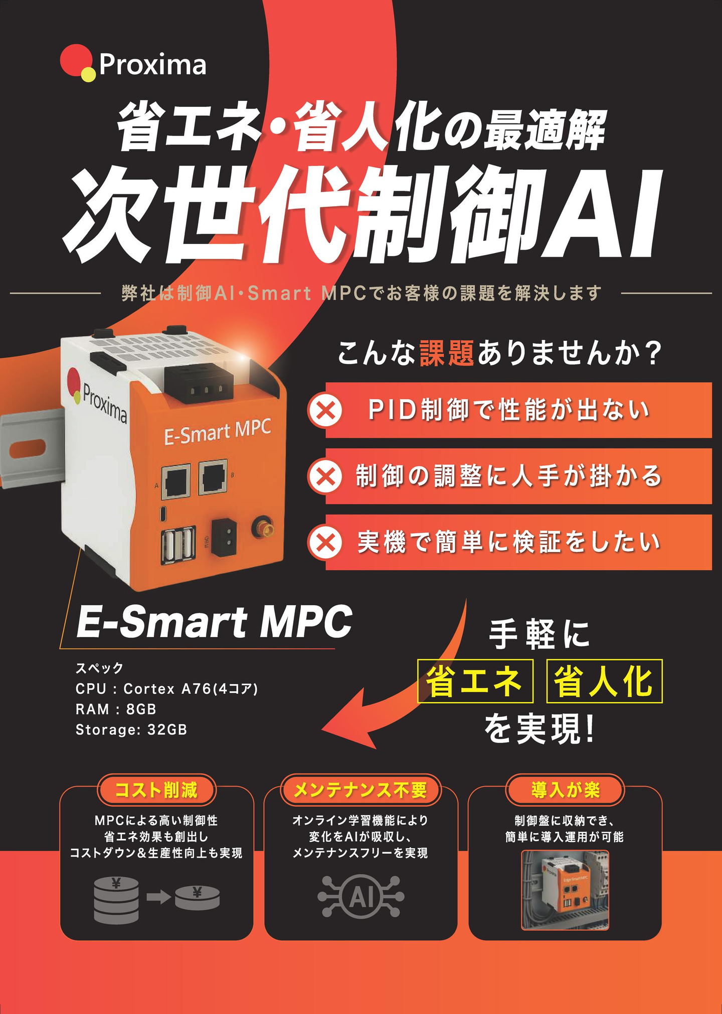 Proxima Technology(プロキシマ テクノロジー)では製造現場向けの独自の制御AIプロダクト「E-Smart MPC」を販売しております。