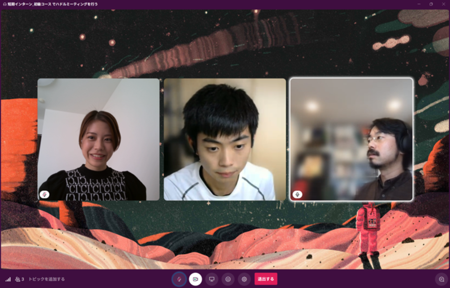 また、アイスブレイクは「24時間以内に起きた嬉しかったことと新しい発⾒について話し合う」というアクティビティになっていて、ここで社員の⽅とのフランクなコミュニケーションをとれたことで、初めての事が多い中でも緊張を和らげることができました。