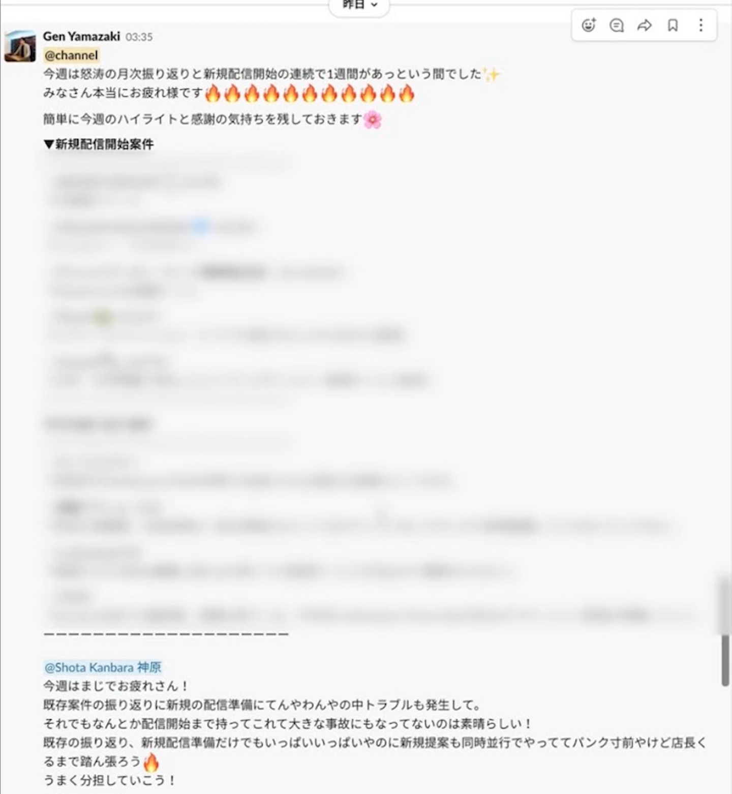 っていう部分もやっていて、ここで「動機付けする力」が活かされていると感じます。動機付けでいくと、今は全メンバーがフルリモートで、テキストコミュニケーションが増えて感情とかが伝わりにくくなってるなと思うので、毎週それぞれのメンバーへの感謝をあえて言葉にして振り返りをしてます。