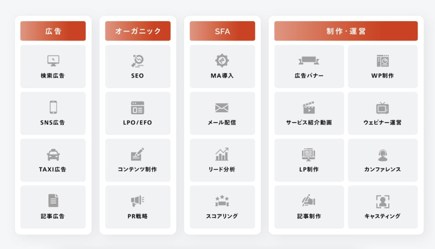 冒頭でREHATCHは一言で説明するなら「Web広告のお仕事」というお話をしましたが、REHATCHが取り扱うマーケティング支援の幅は非常に広く、それが強みの1つでもあります。
