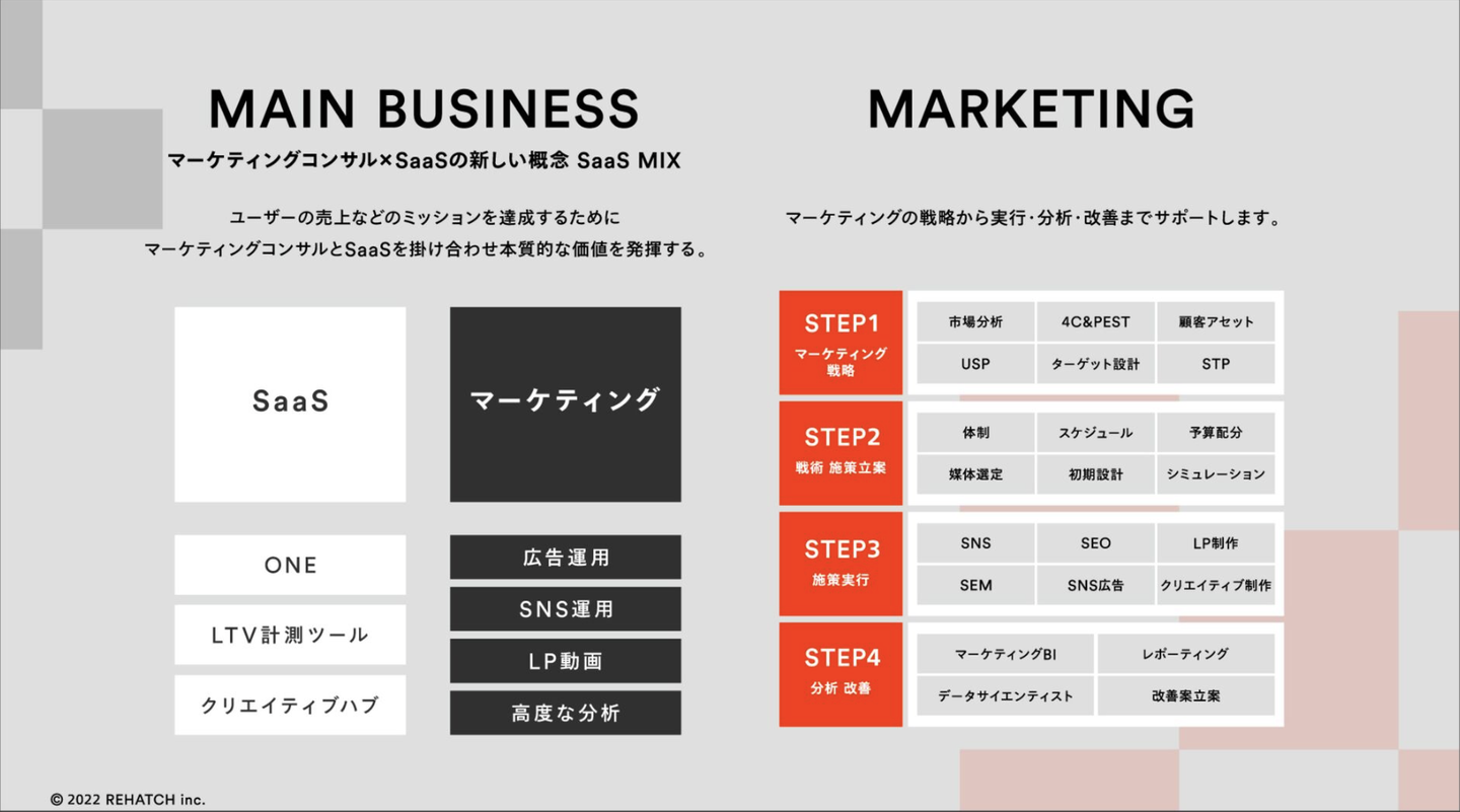 このプロダクトを用いながら、お客様にマーケティングのアドバイスや提案といったコンサルティングを実施することで、お客様の利益を最大化させるというのが、REHATCHが提唱する「SaaS MIX」という新しいビジネスモデルになります。