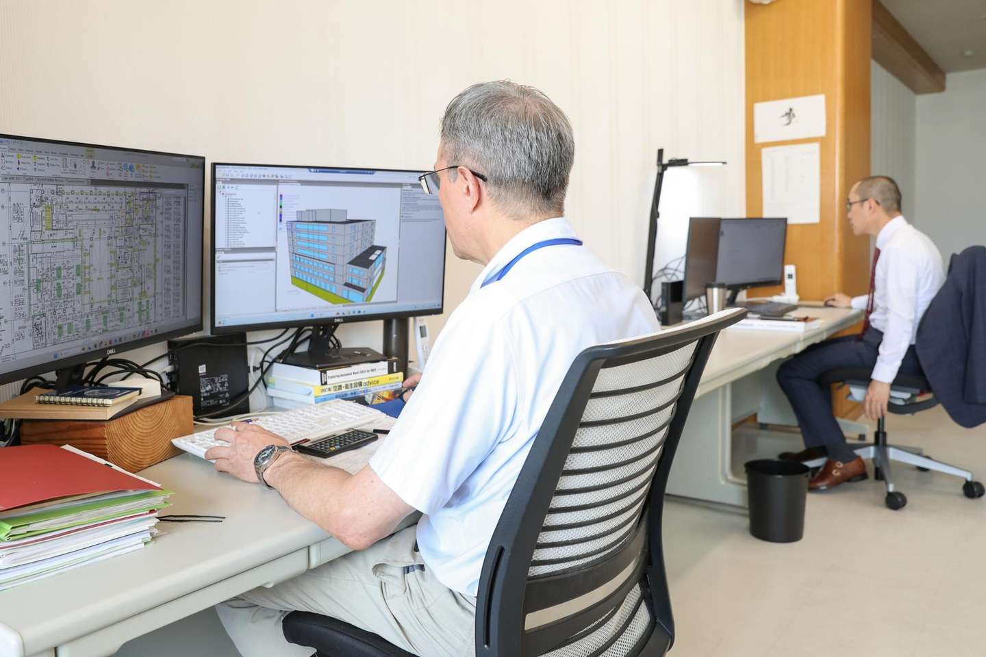 前職同様、設計に携わっています。現場で機器を確認して写真を撮り、図面と照らし合わせながら3Dモデルを作成します。現状パターン、ZEBパターンなど複数の図面を作成して、どのように直していくべきかを山口さんと相談しながら進めています。